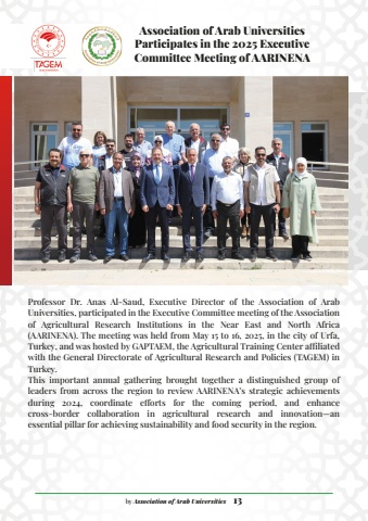 Professor Dr. Anas Al-Saud, Executive Director of the Association of Arab Universities, participated in the Executive Committee meeting of the Association of Agricultural Research Institutions in the Near East and North Africa (AARINENA). The meeting was held from May 15 to 16, 2025, in the city of Urfa, Turkey, and was hosted by GAPTAEM, the Agricultural Training Center affiliated with the General Directorate of Agricultural Research and Policies (TAGEM) in Turkey.This important annual gathering brought together a distinguished group of leaders from across the region to review AARINENA%u2019s strategic achievements during 2024, coordinate efforts for the coming period, and enhance cross-border collaboration in agricultural research and innovation%u2014an essential pillar for achieving sustainability and food security in the region.Association of Arab Universities Participates in the 2025 Executive Committee Meeting of AARINENAby Association of Arab Universities 13
