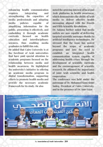 enhancing health communication requires integrating and strengthening the capacities of media professionals and adopting media policies capable of simplifying information for the public, presenting it effectively, and embedding it through academic curricula focused on health education and interdisciplinary sciences, thus enabling media graduates to fulfill this role.He added that Cairo University is at the forefront of Arab universities that have paid special attention to academic programs focused on the relationship between media and health awareness. He highlighted the university%u2019s initiative in offering an academic media program in digital transformation, supporting efforts to promote health media and provide the necessary academic framework for its study. He also noted the growing interest of local and Arab platforms in health awareness, which demonstrates the ability of Arab media to deliver effective health messaging aligned with the Fourth and Fifth Scientific Revolutions.Dr. Salama further noted that media outlets are now capable of delivering targeted scientific messages thanks to artificial intelligence technologies. He stressed that the issue has moved beyond the scope of academic programs and into the need to establish an integrated health communication system capable of addressing health crises through the development of scientific curricula and the encouragement of scientific research. He affirmed the importance of joint Arab scientific and health cooperation.The conference was held under the patronage of Dr. Mohamed Sami Abdel Sadeq, President of Cairo University, and in the presence of Dr. Amr Ezzat by Association of Arab Universities 20