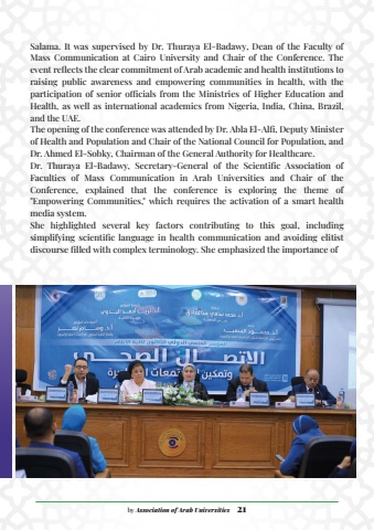 Salama. It was supervised by Dr. Thuraya El-Badawy, Dean of the Faculty of Mass Communication at Cairo University and Chair of the Conference. The event reflects the clear commitment of Arab academic and health institutions to raising public awareness and empowering communities in health, with the participation of senior officials from the Ministries of Higher Education and Health, as well as international academics from Nigeria, India, China, Brazil, and the UAE.The opening of the conference was attended by Dr. Abla El-Alfi, Deputy Minister of Health and Population and Chair of the National Council for Population, and Dr. Ahmed El-Sobky, Chairman of the General Authority for Healthcare.Dr. Thuraya El-Badawy, Secretary-General of the Scientific Association of Faculties of Mass Communication in Arab Universities and Chair of the Conference, explained that the conference is exploring the theme of \media system.She highlighted several key factors contributing to this goal, including simplifying scientific language in health communication and avoiding elitist discourse filled with complex terminology. She emphasized the importance of by Association of Arab Universities 21