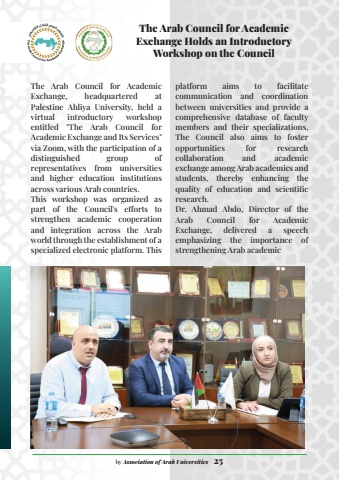 The Arab Council for Academic Exchange, headquartered at Palestine Ahliya University, held a virtual introductory workshop entitled \Academic Exchange and Its Services\via Zoom, with the participation of a distinguished group of representatives from universities and higher education institutions across various Arab countries.This workshop was organized as part of the Council's efforts to strengthen academic cooperation and integration across the Arab world through the establishment of a specialized electronic platform. This platform aims to facilitate communication and coordination between universities and provide a comprehensive database of faculty members and their specializations. The Council also aims to foster opportunities for research collaboration and academic exchange among Arab academics and students, thereby enhancing the quality of education and scientific research.Dr. Ahmad Abdo, Director of the Arab Council for Academic Exchange, delivered a speech emphasizing the importance of strengthening Arab academic The Arab Council for Academic Exchange Holds an Introductory Workshop on the Councilby Association of Arab Universities 25