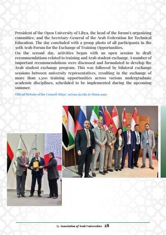 President of the Open University of Libya, the head of the forum%u2019s organizing committee, and the Secretary-General of the Arab Federation for Technical Education. The day concluded with a group photo of all participants in the 30th Arab Forum for the Exchange of Training Opportunities.On the second day, activities began with an open session to draft recommendations related to training and Arab student exchange. A number of important recommendations were discussed and formulated to develop the Arab student exchange program. This was followed by bilateral exchange sessions between university representatives, resulting in the exchange of more than 1,500 training opportunities across various undergraduate academic disciplines, scheduled to be implemented during the upcoming summer.Official Website of the Council: https://actsau.ju.edu.jo/Home.aspxby Association of Arab Universities 28