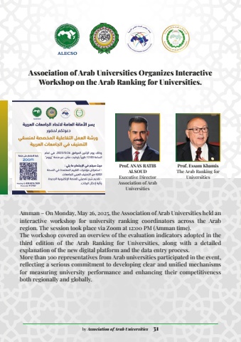 Association of Arab Universities Organizes Interactive Workshop on the Arab Ranking for Universities.Amman %u2013 On Monday, May 26, 2025, the Association of Arab Universities held an interactive workshop for university ranking coordinators across the Arab region. The session took place via Zoom at 12:00 PM (Amman time).The workshop covered an overview of the evaluation indicators adopted in the third edition of the Arab Ranking for Universities, along with a detailed explanation of the new digital platform and the data entry process.More than 300 representatives from Arab universities participated in the event, reflecting a serious commitment to developing clear and unified mechanisms for measuring university performance and enhancing their competitiveness both regionally and globally.by Association of Arab Universities 31Prof. ANAS RATIB ALSOUDExecutive DirectorAssociation of Arab UniversitiesProf. Essam KhamisThe Arab Ranking for Universities