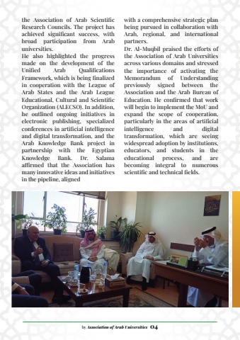 the Association of Arab Scientific Research Councils. The project has achieved significant success, with broad participation from Arab universities.He also highlighted the progress made on the development of the Unified Arab Qualifications Framework, which is being finalized in cooperation with the League of Arab States and the Arab League Educational, Cultural and Scientific Organization (ALECSO). In addition, he outlined ongoing initiatives in electronic publishing, specialized conferences in artificial intelligence and digital transformation, and the Arab Knowledge Bank project in partnership with the Egyptian Knowledge Bank. Dr. Salama affirmed that the Association has many innovative ideas and initiatives in the pipeline, aligned with a comprehensive strategic plan being pursued in collaboration with Arab, regional, and international partners.Dr. Al-Muqbil praised the efforts of the Association of Arab Universities across various domains and stressed the importance of activating the Memorandum of Understanding previously signed between the Association and the Arab Bureau of Education. He confirmed that work will begin to implement the MoU and expand the scope of cooperation, particularly in the areas of artificial intelligence and digital transformation, which are seeing widespread adoption by institutions, educators, and students in the educational process, and are becoming integral to numerous scientific and technical fields.by Association of Arab Universities 04