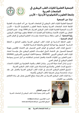%u0646%u0628%u0630%u0629 %u0639%u0646 %u0627%u0644%u062c%u0645%u0639%u064a%u0629 %u0627%u0644%u062c%u0645%u0639%u064a%u0629 %u0627%u0644%u0639%u0644%u0645%u064a%u0629 %u0644%u0643%u0644%u064a%u0627%u062a %u0627%u0644%u0637%u0628 %u0627%u0644%u0628%u064a%u0637%u0631%u064a %u0641%u064a %u0627%u0644%u062c%u0627%u0645%u0639%u0627%u062a %u0627%u0644%u0639%u0631%u0628%u064a%u0629 %u0647%u064a %u0623%u062d%u062f %u0627%u0644%u0645%u0624%u0633%u0633%u0627%u062a %u0627%u0644%u0639%u0644%u0645%u064a%u0629 %u0627%u0644%u062a%u0627%u0628%u0639%u0629 %u0644%u0627%u062a%u062d%u0627%u062f %u0627%u0644%u062c%u0627%u0645%u0639%u0627%u062a %u0627%u0644%u0639%u0631%u0628%u064a%u0629 %u0648%u0645%u0642%u0631%u0647%u0627 %u062c%u0627%u0645%u0639%u0629 %u0627%u0644%u0639%u0644%u0648%u0645 %u0648 %u0627%u0644%u062a%u0643%u0646%u0648%u0644%u0648%u062c%u064a%u0627 %u0627%u0644%u0623%u0631%u062f%u0646%u064a%u0629 %u2013 %u0627%u0644%u0623%u0631%u062f%u0646%u060c %u062a%u0623%u0633%u0633%u062a %u0627%u0644%u062c%u0645%u0639%u064a%u0629 %u0627%u0644%u0639%u0644%u0645%u064a%u0629 %u0644%u0643%u0644%u064a%u0627%u062a %u0627%u0644%u0637%u0628 %u0627%u0644%u0628%u064a%u0637%u0631%u064a %u0627%u0644%u0639%u0631%u0628%u064a%u0629, %u0639%u0627%u0645 1996 %u0628%u0647%u062f%u0641 %u062a%u0639%u0632%u064a%u0632 %u0627%u0644%u062a%u0648%u0627%u0635%u0644 %u0627%u0644%u0641%u0639%u0627%u0644 %u0628%u064a%u0646 %u0627%u0644%u0643%u0644%u064a%u0627%u062a %u0627%u0644%u0623%u0639%u0636%u0627%u0621 %u0648%u0645%u0646%u0627%u0642%u0634%u0629 %u0623%u0647%u0645 %u0627%u0644%u0642%u0636%u0627%u064a%u0627 %u0630%u0627%u062a %u0627%u0644%u0639%u0644%u0627%u0642%u0629 %u0628%u062a%u0637%u0648%u064a%u0631 %u0645%u0647%u0646%u0629 %u0627%u0644%u0637%u0628 %u0627%u0644%u0628%u064a%u0637%u0631%u064a.%u0631%u0624%u064a%u0629 %u0627%u0644%u062c%u0645%u0639%u064a%u0629: %u0623%u0646 %u062a%u0643%u0648%u0646 %u0633%u0644%u0637%u0629 %u0631%u0633%u0645%u064a%u0629 %u0644%u0627%u0639%u062a%u0645%u0627%u062f %u0645%u0624%u0633%u0633%u0627%u062a %u0627%u0644%u062a%u0639%u0644%u064a%u0645 %u0627%u0644%u0628%u064a%u0637%u0631%u064a %u0641%u064a %u0627%u0644%u0648%u0637%u0646 %u0627%u0644%u0639%u0631%u0628%u064a%u0623%u0647%u062f%u0627%u0641 %u0627%u0644%u062c%u0645%u0639%u064a%u0629 :- %u062a%u0637%u0648%u064a%u0631 %u0627%u0644%u062e%u0637%u0637 %u0627%u0644%u062f%u0631%u0627%u0633%u064a%u0629 %u0641%u064a %u0643%u0644%u064a%u0627%u062a %u0627%u0644%u0637%u0628 %u0627%u0644%u0628%u064a%u0637%u0631%u064a %u0627%u0644%u0639%u0631%u0628%u064a%u0629 %u0648%u062a%u0637%u0648%u064a%u0631 %u0627%u0644%u0645%u0646%u0627%u0647%u062c %u0648 %u0627%u0644%u062e%u0637%u0637 %u0627%u0644%u062f%u0631%u0627%u0633%u064a%u0629 %u0627%u0644%u0645%u0639%u0645%u0648%u0644 %u0628%u0647%u0627 %u0644%u0645%u0648%u0627 %u0643%u0628%u0629 %u0627%u0644%u0645%u0646%u0627%u0647%u062c %u0648%u0627%u0644%u062e%u0637%u0637 %u0627%u0644%u062f%u0631%u0627%u0633%u064a%u0629 %u0627%u0644%u0639%u0627%u0644%u0645%u064a%u0629.- %u062a%u0634%u062c%u064a%u0639 %u0643%u0644%u064a%u0627%u062a %u0627%u0644%u0637%u0628 %u0627%u0644%u0628%u064a%u0637%u0631%u064a %u0641%u064a %u0627%u0644%u0648%u0637%u0646 %u0627%u0644%u0639%u0631%u0628%u064a %u0644%u0644%u062d%u0635%u0648%u0644 %u0639%u0644%u0649 %u0627%u0644%u0627%u0639%u062a%u0645%u0627%u062f %u0627%u0644%u0625%u0642%u0644%u064a%u0645%u064a %u0648%u062a%u0647%u064a%u0626%u0629 %u0627%u0644%u062c%u0645%u0639%u064a%u0629 %u0644%u0644%u062d%u0635%u0648%u0644 %u0639%u0644%u0649 %u0627%u0644%u0627%u0639%u062a%u0645%u0627%u062f %u0627%u0644%u062f%u0648%u0644%u064a %u0644%u0645%u0624%u0633%u0633%u0627%u062a %u0627%u0644%u062a%u0639%u0644%u064a%u0645 %u0627%u0644%u0628%u064a%u0637%u0631%u064a %u0645%u062b%u0644 %u0645%u0624%u0633%u0633%u0629 %u0627%u0639%u062a%u0645%u0627%u062f %u0643%u0644%u064a%u0627%u062a %u0627%u0644%u0637%u0628 %u0627%u0644%u0628%u064a%u0637%u0631%u064a %u0627%u0644%u0623%u0648%u0631%u0648%u0628%u064a (EAEVE (%u0648%u062c%u0645%u0639%u064a%u0629 %u0627%u0644%u0623%u0637%u0628%u0627%u0621 %u0627%u0644%u0628%u064a%u0637%u0631%u064a%u064a%u0646 %u0627%u0644%u0623%u0645%u0631%u064a%u0643%u064a%u064a%u0646 (AVMA(- %u062a%u0639%u0632%u064a%u0632 %u0627%u0644%u062a%u0639%u0627%u0648%u0646 %u0628%u064a%u0646 %u0627%u0644%u0643%u0644%u064a%u0627%u062a %u0627%u0644%u0623%u0639%u0636%u0627%u0621 %u0648%u0627%u0644%u0639%u0645%u0644 %u0643%u0645%u0646%u062a%u062f%u0649 %u0644%u0645%u0646%u0627%u0642%u0634%u062a%u0647 %u0645%u0646 %u0623%u062c%u0644 %u062a%u062d%u0633%u064a%u0646 %u0648%u0645%u0648%u0627%u0621%u0645%u0629 %u0627%u0644%u062a%u0639%u0644%u064a%u0645 %u0627%u0644%u0628%u064a%u0637%u0631%u064a %u0641%u064a %u0627%u0644%u0648%u0637%u0646 %u0627%u0644%u0639%u0631%u0628%u064a- %u062a%u064a%u0633%u064a%u0631 %u062a%u0628%u0627%u062f%u0644 %u0623%u0639%u0636%u0627%u0621 %u0647%u064a%u0626%u0629 %u0627%u0644%u062a%u062f%u0631%u064a%u0633 %u0648%u062a%u0628%u0627%u062f%u0644 %u0627%u0644%u0637%u0644%u0627%u0628 %u0648%u0627%u0644%u0645%u0648%u0627%u062f %u0627%u0644%u062a%u0639%u0644%u064a%u0645%u064a%u0629 %u0628%u064a%u0646 %u0627%u0644%u0643%u0644%u064a%u0627%u062a %u0627%u0644%u0627%u0639%u0636%u0627%u0621.- %u062a%u0634%u062c%u064a%u0639 %u0627%u0644%u0628%u062d%u062b %u0627%u0644%u0639%u0644%u0645%u064a %u0648%u0627%u0644%u0645%u0634%u0627%u0631%u064a%u0639 %u0627%u0644%u0645%u0634%u062a%u0631%u0643%u0629 %u0645%u0627%u0628%u064a%u0646 %u0643%u0644%u064a%u0627%u062a %u0627%u0644%u0637%u0628 %u0627%u0644%u0628%u0637%u0631%u064a %u0627%u0644%u0639%u0631%u0628%u064a%u0629.- %u062a%u0634%u062c%u064a%u0639 %u0627%u0644%u062a%u0639%u0644%u064a%u0645 %u0627%u0644%u0628%u064a%u0637%u0631%u064a %u0627%u0644%u0645%u0633%u062a%u0645%u0631 %u0641%u064a %u0643%u0644%u064a%u0627%u062a %u0627%u0644%u0637%u0628 %u0627%u0644%u0628%u064a%u0637%u0631%u064a %u0627%u0644%u0639%u0631%u0628%u064a%u0629 %u0648%u0627%u0644%u0639%u0645%u0644 %u0639%u0644%u0649 %u0639%u0642%u062f %u062f%u0648%u0631%u0627%u062a %u0645%u062a%u062e%u0635%u0635%u0629 %u0648%