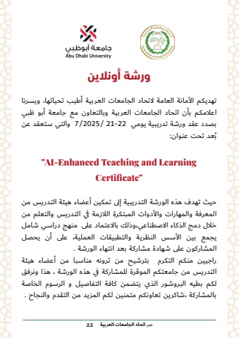 %u0648%u0631%u0634%u0629 %u0623%u0648%u0646%u0644%u0627%u064a%u0646%u062a%u0647%u062f%u064a%u0643%u0645 %u0627%u0644%u0623%u0645%u0627%u0646%u0629 %u0627%u0644%u0639%u0627%u0645%u0629 %u0644%u0627%u062a%u062d%u0627%u062f %u0627%u0644%u062c%u0627%u0645%u0639%u0627%u062a %u0627%u0644%u0639%u0631%u0628%u064a%u0629 %u0623%u0637%u064a%u0628 %u062a%u062d%u064a%u0627%u062a%u0647%u0627%u060c %u0648%u064a%u0633%u0631%u0646%u0627 %u0627%u0639%u0644%u0627%u0645%u0643%u0645 %u0628%u0623%u0646 %u0627%u062a%u062d%u0627%u062f %u0627%u0644%u062c%u0627%u0645%u0639%u0627%u062a %u0627%u0644%u0639%u0631%u0628%u064a%u0629 %u0648%u0628%u0627%u0644%u062a%u0639%u0627%u0648%u0646 %u0645%u0639 %u062c%u0627%u0645%u0639%u0629 %u0623%u0628%u0648 %u0638%u0628%u064a %u0628%u0635%u062f%u062f %u0639%u0642%u062f %u0648%u0631%u0634%u0629 %u062a%u062f%u0631%u064a%u0628%u064a%u0629 %u064a%u0648%u0645%u064a 22-21/ 2025/7 %u0648%u0627%u0644%u062a%u064a %u0633%u062a%u0639%u0642%u062f %u0639%u0646 %u064f%u0639%u062f %u062a%u062d%u062a %u0639%u0646%u0648%u0627%u0646:%u0628\Certificate\%u062d%u064a%u062b %u062a%u0647%u062f%u0641 %u0647%u0630%u0647 %u0627%u0644%u0648%u0631%u0634%u0629 %u0627%u0644%u062a%u062f%u0631%u064a%u0628%u064a%u0629 %u0625%u0644%u0649 %u062a%u0645%u0643%u064a%u0646 %u0623%u0639%u0636%u0627%u0621 %u0647%u064a%u0626%u0629 %u0627%u0644%u062a%u062f%u0631%u064a%u0633 %u0645%u0646 %u0627%u0644%u0645%u0639%u0631%u0641%u0629 %u0648%u0627%u0644%u0645%u0647%u0627%u0631%u0627%u062a %u0648%u0627%u0644%u0623%u062f%u0648%u0627%u062a %u0627%u0644%u0645%u0628%u062a%u0643%u0631%u0629 %u0627%u0644%u0644%u0627%u0632%u0645%u0629 %u0641%u064a %u0627%u0644%u062a%u062f%u0631%u064a%u0633 %u0648%u0627%u0644%u062a%u0639%u0644%u0645 %u0645%u0646 %u062e%u0644%u0627%u0644 %u062f%u0645%u062c %u0627%u0644%u0630%u0643%u0627%u0621 %u0627%u0644%u0627%u0635%u0637%u0646%u0627%u0639%u064a%u060c%u0648%u0630%u0644%u0643 %u0628%u0627%u0644%u0627%u0639%u062a%u0645%u0627%u062f %u0639%u0644%u0649 %u0645%u0646%u0647%u062c %u062f%u0631%u0627%u0633%u064a %u0634%u0627%u0645%u0644 %u064a%u062c%u0645%u0639 %u0628%u064a%u0646 %u0627%u0644%u0623%u0633%u0633 %u0627%u0644%u0646%u0638%u0631%u064a%u0629 %u0648%u0627%u0644%u062a%u0637%u0628%u064a%u0642%u0627%u062a %u0627%u0644%u0639%u0645%u0644%u064a%u0629%u060c %u0639%u0644%u0649 %u0623%u0646 %u064a%u062d%u0635%u0644 %u0627%u0644%u0645%u0634%u0627%u0631%u0643%u0648%u0646 %u0639%u0644%u0649 %u0634%u0647%u0627%u062f%u0629 %u0645%u0634%u0627%u0631%u0643%u0629 %u0628%u0639%u062f %u0627%u0646%u062a%u0647%u0627%u0621 %u0627%u0644%u0648%u0631%u0634%u0629 .%u0631%u0627%u062c%u064a%u064a%u0646 %u0645%u0646%u0643%u0645 %u0627%u0644%u062a%u0643%u0631%u0645 %u0628%u062a%u0631%u0634%u064a%u062d %u0645%u0646 %u062a%u0631%u0648%u0646%u0647 %u0645%u0646%u0627%u0633%u0628%u0627 %u0645%u0646 %u0623%u0639%u0636%u0627%u0621 %u0647%u064a%u0626%u0629 %u0627%u0644%u062a%u062f%u0631%u064a%u0633 %u0645%u0646 %u062c%u0627%u0645%u0639%u062a%u0643%u0645 %u0627%u0644%u0645%u0648%u0642%u0631%u0629 %u0644%u0644%u0645%u0634%u0627%u0631%u0643%u0629 %u0641%u064a %u0647%u0630%u0647 %u0627%u0644%u0648%u0631%u0634%u0629 %u060c %u0647%u0630%u0627 %u0648%u0646%u0631%u0641%u0642 %u0644%u0643%u0645 %u0628%u0637%u064a%u0647 %u0627%u0644%u0628%u0631%u0648%u0634%u0648%u0631 %u0627%u0644%u0630%u064a %u064a%u062a%u0636%u0645%u0646 %u0643%u0627%u0641%u0629 %u0627%u0644%u062a%u0641%u0627%u0635%u064a%u0644 %u0648 %u0627%u0644%u0631%u0633%u0648%u0645 %u0627%u0644%u062e%u0627%u0635%u0629 %u0628%u0627%u0644%u0645%u0634%u0627%u0631%u0643%u0629 %u060c%u0634%u0627%u0643%u0631%u064a%u0646 %u062a%u0639%u0627%u0648%u0646%u0643%u0645 %u0645%u062a%u0645%u0646%u064a%u0646 %u0644%u0643%u0645 %u0627%u0644%u0645%u0632%u064a%u062f %u0645%u0646 %u0627%u0644%u062a%u0642%u062f%u0645 %u0648%u0627%u0644%u0646%u062c%u0627%u062d .%u0639%u0628%u0631 %u0627%u062a%u062d%u0627%u062f %u0627%u0644%u062c%u0627%u0645%u0639%u0627%u062a %u0627%u0644%u0639%u0631%u0628%u064a%u0629 22