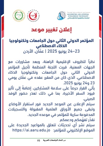 %u0625%u0639%u0644%u0627%u0646 %u062a%u063a%u064a%u064a%u0631 %u0645%u0648%u0639%u062f%u0627%u0644%u0645%u0624%u062a%u0645%u0631 %u0627%u0644%u062f%u0648%u0644%u064a %u0627%u0644%u062b%u0627%u0646%u064a %u062d%u0648%u0644 %u0627%u0644%u062c%u0627%u0645%u0639%u0627%u062a %u0648%u062a%u0643%u0646%u0648%u0644%u0648%u062c%u064a%u0627 %u0627%u0644%u0630%u0643%u0627%u0621 %u0627%u0644%u0627%u0635%u0637%u0646%u0627%u0639%u064a23%u201324 %u064a%u0648%u0646%u064a%u0648 2025 | %u0651 %u0639%u0645%u0627%u0646%u060c %u0627%u0644%u0623%u0631%u062f%u0646%u0646%u0638%u0631%u0627%u064b %u0644%u0644%u0638%u0631%u0648%u0641 %u0627%u0644%u0625%u0642%u0644%u064a%u0645%u064a%u0629 %u0627%u0644%u0631%u0627%u0647%u0646%u0629%u060c %u0648%u0628%u0639%u062f %u0645%u0634%u0627%u0648%u0631%u0627%u062a %u0645%u0639 %u0627%u0644%u062c%u0647%u0627%u062a %u0627%u0644%u0645%u0639%u0646%u064a%u0629%u060c %u0642%u0631%u0631%u062a %u0627%u0644%u0644%u062c%u0646%u0629 %u0627%u0644%u0645%u0646%u0638%u0645%u0629 %u062a%u0623%u062c%u064a%u0644 %u0627%u0644%u0645%u0624%u062a%u0645%u0631 %u0627%u0644%u062f%u0648%u0644%u064a %u0627%u0644%u062b%u0627%u0646%u064a %u062d%u0648%u0644 %u0627%u0644%u062c%u0627%u0645%u0639%u0627%u062a %u0648%u062a%u0643%u0646%u0648%u0644%u0648%u062c%u064a%u0627 %u0627%u0644%u0630%u0643%u0627%u0621 %u0651 %u0627%u0644%u0627%u0635%u0637%u0646%u0627%u0639%u064a%u060c %u0627%u0644%u0630%u064a %u0643%u0627%u0646 %u0645%u0646 %u0627%u0644%u0645%u0642%u0631%u0631 %u0639%u0642%u062f%u0647 %u0641%u064a %u0639%u0645%u0627%u0646 %u064a%u0648%u0645%u064a .2025 %u064a%u0648%u0646%u064a%u0648 24%u0648 23%u064b %u064a%u0623%u062a%u064a %u0627%u0644%u0642%u0631%u0627%u0631 %u062d%u0631%u0635%u0627%u064b %u0639%u0644%u0649 %u0633%u0644%u0627%u0645%u0629 %u0627%u0644%u0645%u0634%u0627%u0631%u0643%u064a%u0646%u060c %u0625%u0636%u0627%u0641%u0629 %u0625%u0644%u0649 %u062a%u0623%u062b%u064a%u0631 %u0642%u064a%u0648%u062f %u0627%u0644%u0633%u0641%u0631 %u0627%u0644%u0623%u062e%u064a%u0631%u0629%u060c %u0628%u0645%u0627 %u0641%u064a %u0630%u0644%u0643 %u062a%u0639%u0630%u0631 %u062d%u0636%u0648%u0631 %u0627%u0644%u0648%u0641%u062f %u0627%u0644%u0635%u064a%u0646%u064a.%u0633%u064a%u062a%u0645 %u0627%u0644%u0625%u0639%u0644%u0627%u0646 %u0639%u0646 %u0627%u0644%u0645%u0648%u0639%u062f %u0627%u0644%u062c%u062f%u064a%u062f %u0641%u0648%u0631 %u0627%u0633%u062a%u0642%u0631%u0627%u0631 %u0627%u0644%u0623%u0648%u0636%u0627%u0639. %u0648%u062a%u0628%u0642%u0649 %u062c%u0645%u064a%u0639 %u0627%u0644%u0623%u0648%u0631%u0627%u0642 %u0627%u0644%u0639%u0644%u0645%u064a%u0629 %u0627%u0644%u0645%u0642%u0628%u0648%u0644%u0629 %u0648%u0627%u0644%u062a%u0633%u062c%u064a%u0644%u0627%u062a %u0627%u0644%u0645%u062f%u0641%u0648%u0639%u0629 %u0633%u0627%u0631%u064a%u0629 %u0644%u0644%u0645%u0624%u062a%u0645%u0631 %u0641%u064a %u0645%u0648%u0639%u062f%u0647 %u0627%u0644%u062c%u062f%u064a%u062f.%u0651 %u0646%u0642%u062f %u0651 %u0631 %u062a%u0641%u0647%u0645%u0643%u0645 %u0648%u062f%u0639%u0645%u0643%u0645%u0633%u064a%u062a%u0645 %u0646%u0634%u0631 %u0623%u064a %u062a%u062d%u062f%u064a%u062b%u0627%u062a %u062a%u062a%u0639%u0644%u0642 %u0628%u0627%u0644%u0645%u0648%u0627%u0639%u064a%u062f %u0627%u0644%u062c%u062f%u064a%u062f%u0629 %u0639%u0644%u0649 https://ai.aaru.edu.jo :%u0644%u0644%u0645%u0624%u062a%u0645%u0631 %u0627%u0644%u0625%u0644%u0643%u062a%u0631%u0648%u0646%u064a %u0627%u0644%u0645%u0648%u0642%u0639%u0639%u0628%u0631 %u0627%u062a%u062d%u0627%u062f %u0627%u0644%u062c%u0627%u0645%u0639%u0627%u062a %u0627%u0644%u0639%u0631%u0628%u064a%u0629 25