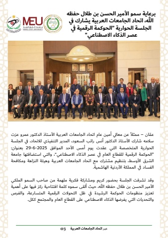 %u0651%u0639%u0645%u0627%u0646 %u2013 %u0645%u0645%u062b%u0644%u0627%u064b %u0639%u0646 %u0645%u0639%u0627%u0644%u064a %u0623%u0645%u064a%u0646 %u0639%u0627%u0645 %u0627%u062a%u062d%u0627%u062f %u0627%u0644%u062c%u0627%u0645%u0639%u0627%u062a %u0627%u0644%u0639%u0631%u0628%u064a%u0629 %u0627%u0644%u0623%u0633%u062a%u0627%u0630 %u0627%u0644%u062f%u0643%u062a%u0648%u0631 %u0639%u0645%u0631%u0648 %u0639%u0632%u062a %u0633%u0644%u0627%u0645%u0647 %u0634%u0627%u0631%u0643 %u0627%u0644%u0623%u0633%u062a%u0627%u0630 %u0627%u0644%u062f%u0643%u062a%u0648%u0631 %u0623%u0646%u0633 %u0631%u0627%u062a%u0628 %u0627%u0644%u0633%u0639%u0648%u062f%u060c %u0627%u0644%u0645%u062f%u064a%u0631 %u0627%u0644%u062a%u0646%u0641%u064a%u0630%u064a %u0644%u0644%u0627%u062a%u062d%u0627%u062f%u060c %u0641%u064a %u0627%u0644%u062c%u0644%u0633%u0629 %u0627%u0644%u062d%u0648%u0627%u0631%u064a%u0629 %u0627%u0644%u0645%u062a%u062e%u0635%u0635%u0629 %u0627%u0644%u062a%u064a %u0639%u0642%u062f%u062a %u064a%u0648%u0645 %u0623%u0645%u0633 %u0627%u0644%u0623%u062d%u062f %u0627%u0644%u0645%u0648%u0627%u0641%u0642 2025-6-29 %u0628%u0639%u0646%u0648%u0627%u0646: %u201c%u0627%u0644%u062d%u0648%u0643%u0645%u0629 %u0627%u0644%u0631%u0642%u0645%u064a%u0629 %u0644%u0644%u0642%u0637%u0627%u0639 %u0627%u0644%u0639%u0627%u0645 %u0641%u064a %u0639%u0635%u0631 %u0627%u0644%u0630%u0643%u0627%u0621 %u0627%u0644%u0627%u0635%u0637%u0646%u0627%u0639%u064a%u201d%u060c %u0648%u0627%u0644%u062a%u064a %u0627%u0633%u062a%u0636%u0627%u0641%u062a%u0647%u0627 %u062c%u0627%u0645%u0639%u0629 %u0627%u0644%u0634%u0631%u0642 %u0627%u0644%u0623%u0648%u0633%u0637%u060c %u0628%u062a%u0646%u0638%u064a%u0645 %u0645%u0634%u062a%u0631%u0643 %u0645%u0639 %u0627%u062a%u062d%u0627%u062f %u0627%u0644%u062c%u0627%u0645%u0639%u0627%u062a %u0627%u0644%u0639%u0631%u0628%u064a%u0629 %u0648%u0647%u064a%u0626%u0629 %u0627%u0644%u0646%u0632%u0627%u0647%u0629 %u0648%u0645%u0643%u0627%u0641%u062d%u0629 %u0627%u0644%u0641%u0633%u0627%u062f %u0641%u064a %u0627%u0644%u0645%u0645%u0644%u0643%u0629 %u0627%u0644%u0623%u0631%u062f%u0646%u064a%u0629 %u0627%u0644%u0647%u0627%u0634%u0645%u064a%u0629.%u0648%u0642%u062f %u062a%u0634%u0631%u0641%u062a %u0627%u0644%u062c%u0644%u0633%u0629 %u0628%u062d%u0636%u0648%u0631 %u0643%u0631%u064a%u0645 %u0648%u0645%u0634%u0627%u0631%u0643%u0629 %u0641%u0643%u0631%u064a%u0629 %u0645%u0644%u0647%u0645%u0629 %u0645%u0646 %u0635%u0627%u062d%u0628 %u0627%u0644%u0633%u0645%u0648 %u0627%u0644%u0645%u0644%u0643%u064a %u0627%u0644%u0623%u0645%u064a%u0631 %u0627%u0644%u062d%u0633%u0646 %u0628%u0646 %u0637%u0644%u0627%u0644 %u062d%u0641%u0638%u0647 %u0627%u0644%u0644%u0647%u060c %u062d%u064a%u062b %u0623%u0644%u0642%u0649 %u0633%u0645%u0648%u0647 %u0643%u0644%u0645%u0629 %u0627%u0641%u062a%u062a%u0627%u062d%u064a%u0629 %u0631%u0643%u0632 %u0641%u064a%u0647%u0627 %u0639%u0644%u0649 %u0623%u0647%u0645%u064a%u0629 %u062a%u0639%u0632%u064a%u0632 %u0645%u0646%u0638%u0648%u0645%u0627%u062a %u0627%u0644%u062d%u0648%u0643%u0645%u0629 %u0627%u0644%u0631%u0634%u064a%u062f%u0629 %u0641%u064a %u0638%u0644 %u0627%u0644%u062a%u062d%u0648%u0644%u0627%u062a %u0627%u0644%u0631%u0642%u0645%u064a%u0629 %u0627%u0644%u0645%u062a%u0633%u0627%u0631%u0639%u0629%u060c %u0648%u0627%u0644%u0641%u0631%u0635 %u0648%u0627%u0644%u062a%u062d%u062f%u064a%u0627%u062a %u0627%u0644%u062a%u064a %u064a%u0641%u0631%u0636%u0647%u0627 %u0627%u0644%u0630%u0643%u0627%u0621 %u0627%u0644%u0627%u0635%u0637%u0646%u0627%u0639%u064a %u0639%u0644%u0649 %u0627%u0644%u0642%u0637%u0627%u0639 %u0627%u0644%u0639%u0627%u0645 %u0648%u0627%u0644%u0645%u062c%u062a%u0645%u0639 %u0643%u0643%u0644.%u0639%u0628%u0631 %u0627%u062a%u062d%u0627%u062f %u0627%u0644%u062c%u0627%u0645%u0639%u0627%u062a %u0627%u0644%u0639%u0631%u0628%u064a%u0629 03%u0628%u0631%u0639%u0627%u064a%u0629 %u0633%u0645%u0648 %u0627%u0644%u0623%u0645%u064a%u0631 %u0627%u0644%u062d%u0633%u0646 %u0628%u0646 %u0637%u0644%u0627%u0644 %u062d%u0641%u0638%u0647 %u0627%u0644%u0644%u0647%u060c %u0627%u062a%u062d%u0627%u062f %u0627%u0644%u062c%u0627%u0645%u0639%u0627%u062a %u0627%u0644%u0639%u0631%u0628%u064a%u0629 %u064a%u0634%u0627%u0631%u0643 %u0641%u064a %u0627%u0644%u062c%u0644%u0633%u0629 %u0627%u0644%u062d%u0648%u0627%u0631%u064a%u0629 %u201c%u0627%u0644%u062d%u0648%u0643%u0645%u0629 %u0627%u0644%u0631%u0642%u0645%u064a%u0629 %u0641%u064a %u0639%u0635%u0631 %u0627%u0644%u0630%u0643%u0627%u0621 %u0627%u0644%u0627%u0635%u0637%u0646%u0627%u0639%u064a\