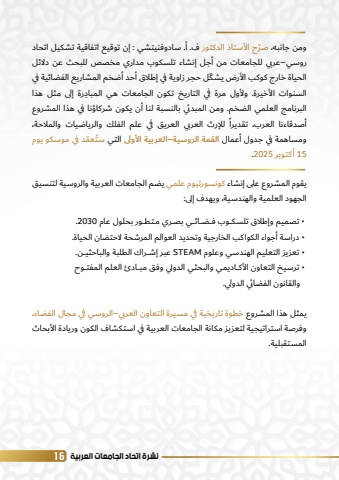 %u0648%u0645%u0646 %u062c%u0627%u0646%u0628%u0647%u060c %u0651%u0635%u0631%u062d %u0627%u0644%u0623%u0633%u062a%u0627%u0630 %u0627%u0644%u062f%u0643%u062a%u0648%u0631 %u0641. %u0623. %u0633%u0627%u062f%u0648%u0641%u0646%u064a%u062a%u0634%u064a : %u0625%u0646 %u062a%u0648%u0642%u064a%u0639 %u0627%u062a%u0641%u0627%u0642%u064a%u0629 %u062a%u0634%u0643%u064a%u0644 %u0627%u062a%u062d%u0627%u062f %u0631%u0648%u0633%u064a%u2013%u0639%u0631%u0628%u064a %u0644%u0644%u062c%u0627%u0645%u0639%u0627%u062a %u0645%u0646 %u0623%u062c%u0644 %u0625%u0646%u0634%u0627%u0621 %u062a%u0644%u0633%u0643%u0648%u0628 %u0645%u062f%u0627%u0631%u064a %u0645%u062e%u0635%u0635 %u0644%u0644%u0628%u062d%u062b %u0639%u0646 %u062f%u0644%u0627%u0626%u0644 %u0627%u0644%u062d%u064a%u0627%u0629 %u062e%u0627%u0631%u062c %u0643%u0648%u0643%u0628 %u0627%u0644%u0623%u0631%u0636 %u064a%u0634%u0643%u0651%u0644 %u062d%u062c%u0631 %u0632%u0627%u0648%u064a%u0629 %u0641%u064a %u0625%u0637%u0644%u0627%u0642 %u0623%u062d%u062f %u0623%u0636%u062e%u0645 %u0627%u0644%u0645%u0634%u0627%u0631%u064a%u0639 %u0627%u0644%u0641%u0636%u0627%u0626%u064a%u0629 %u0641%u064a %u0627%u0644%u0633%u0646%u0648%u0627%u062a %u0627%u0644%u0623%u062e%u064a%u0631%u0629. %u0648%u0644%u0623%u0648%u0644 %u0645%u0631%u0629 %u0641%u064a %u0627%u0644%u062a%u0627%u0631%u064a%u062e %u062a%u0643%u0648%u0646 %u0627%u0644%u062c%u0627%u0645%u0639%u0627%u062a %u0647%u064a %u0627%u0644%u0645%u0628%u0627%u062f%u0650%u0631%u0629 %u0625%u0644%u0649 %u0645%u062b%u0644 %u0647%u0630%u0627 %u0627%u0644%u0628%u0631%u0646%u0627%u0645%u062c %u0627%u0644%u0639%u0644%u0645%u064a %u0627%u0644%u0636%u062e%u0645. %u0648%u0645%u0646 %u0627%u0644%u0645%u0628%u062f%u0626%u064a %u0628%u0627%u0644%u0646%u0633%u0628%u0629 %u0644%u0646%u0627 %u0623%u0646 %u064a%u0643%u0648%u0646 %u0634%u0631%u0643%u0627%u0624%u0646%u0627 %u0641%u064a %u0647%u0630%u0627 %u0627%u0644%u0645%u0634%u0631%u0648%u0639 %u0623%u0635%u062f%u0642%u0627%u0621%u0646%u0627 %u0627%u0644%u0639%u0631%u0628%u060c %u062a%u0642%u062f%u064a%u0631%u0627%u064b %u0644%u0644%u0625%u0631%u062b %u0627%u0644%u0639%u0631%u0628%u064a %u0627%u0644%u0639%u0631%u064a%u0642 %u0641%u064a %u0639%u0644%u0645 %u0627%u0644%u0641%u0644%u0643 %u0648%u0627%u0644%u0631%u064a%u0627%u0636%u064a%u0627%u062a %u0648%u0627%u0644%u0645%u0644%u0627%u062d%u0629%u060c %u0648%u0645%u0633%u0627%u0647%u0645%u0629 %u0641%u064a %u062c%u062f%u0648%u0644 %u0623%u0639%u0645%u0627%u0644 %u0627%u0644%u0642%u0645%u0629 %u0627%u0644%u0631%u0648%u0633%u064a%u0629%u2013%u0627%u0644%u0639%u0631%u0628%u064a%u0629 %u0627%u0644%u0623%u0648%u0644%u0649 %u0627%u0644%u062a%u064a %u064f%u0633%u062a%u0639%u0642%u062f %u0641%u064a %u0645%u0648%u0633%u0643%u0648 %u064a%u0648%u0645 .2025 %u0623%u0643%u062a%u0648%u0628%u0631 15%u064a%u0642%u0648%u0645 %u0627%u0644%u0645%u0634%u0631%u0648%u0639 %u0639%u0644%u0649 %u0625%u0646%u0634%u0627%u0621 %u0643%u0648%u0646%u0633%u0648%u0631%u062a%u064a%u0648%u0645 %u0639%u0644%u0645%u064a %u064a%u0636%u0645 %u0627%u0644%u062c%u0627%u0645%u0639%u0627%u062a %u0627%u0644%u0639%u0631%u0628%u064a%u0629 %u0648%u0627%u0644%u0631%u0648%u0633%u064a%u0629 %u0644%u062a%u0646%u0633%u064a%u0642 %u0627%u0644%u062c%u0647%u0648%u062f %u0627%u0644%u0639%u0644%u0645%u064a%u0629 %u0648%u0627%u0644%u0647%u0646%u062f%u0633%u064a%u0629%u060c %u0648%u064a%u0647%u062f%u0641 %u0625%u0644%u0649: %u2022 %u062a%u0635%u0645%u064a%u0645 %u0648%u0625%u0637%u0644%u0627%u0642 %u062a%u0644%u0633%u0643%u0640%u0640%u0640%u0648%u0628 %u0641%u0640%u0640%u0640%u0636%u0640%u0640%u0640%u0627%u0626%u0640%u0640%u0640%u064a %u0628%u0635%u0640%u0640%u0631%u064a %u0645%u0640%u062a%u0640%u0637%u0640%u0640%u0640%u0648%u0631 %u0628%u062d%u0644%u0648%u0644 %u0639%u0627%u0645 2030. %u2022 %u062f%u0631%u0627%u0633%u0629 %u0623%u062c%u0648%u0627%u0621 %u0627%u0644%u0643%u0648%u0627%u0643%u0628 %u0627%u0644%u062e%u0627%u0631%u062c%u064a%u0629 %u0648%u062a%u062d%u062f%u064a%u062f %u0627%u0644%u0639%u0648%u0627%u0644%u0645 %u0627%u0644%u0645%u0631%u0634%u062d%u0629 %u0644%u0627%u062d%u062a%u0636%u0627%u0646 %u0627%u0644%u062d%u064a%u0627%u0629. %u2022 %u062a%u0639%u0632%u064a%u0632 %u0627%u0644%u062a%u0639%u0644%u064a%u0645 %u0627%u0644%u0647%u0646%u062f%u0633%u064a %u0648%u0639%u0644%u0648%u0645 STEAM %u0639%u0628%u0631 %u0625%u0634%u0640%u0640%u0640%u0631%u0627%u0643 %u0627%u0644%u0637%u0644%u0628%u0629 %u0648%u0627%u0644%u0628%u0627%u062d%u062b%u064a%u0640%u0640%u0640%u0646. %u2022 %u062a%u0631%u0633%u064a%u062e %u0627%u0644%u062a%u0639%u0627%u0648%u0646 %u0627%u0644%u0623%u0643%u0640%u0640%u0640%u0627%u062f%u064a%u0645%u064a %u0648%u0627%u0644%u0628%u062d%u062b%u064a %u0627%u0644%u062f%u0648%u0644%u064a %u0648%u0641%u0642 %u0645%u0628%u0640%u0640%u0640%u0627%u062f%u0626 %u0627%u0644%u0639%u0644%u0645 %u0627%u0644%u0645%u0641%u062a%u0640%u0640%u0640%u0648%u062d %u0648%u0627%u0644%u0642%u0627%u0646%u0648%u0646 %u0627%u0644%u0641%u0636%u0627%u0626%u064a %u0627%u0644%u062f%u0648%u0644%u064a.%u064a%u0645%u062b%u0644 %u0647%u0630%u0627 %u0627%u0644%u0645%u0634%u0631%u0648%u0639 %u062e%u0637%u0648%u0629 %u062a%u0627%u0631%u064a%u062e%u064a%u0629 %u0641%u064a %u0645%u0633%u064a%u0631%u0629 %u0627%u0644%u062a%u0639%u0627%u0648%u0646 %u0627%u0644%u0639%u0631%u0628%u064a%u2013%u0627%u0644%u0631%u0648%u0633%u064a %u0641%u064a %u0645%u062c%u0627%u0644 %u0627%u0644%u0641%u0636%u0627%u0621%u060c%u0648%u0641%u0631%u0635%u0629 %u0627%u0633%u062a%u0631%u0627%u062a%u064a%u062c%u064a%u0629 %u0644%u062a%u0639%u0632%u064a%u0632 %u0645%u0643%u0627%u0646%u0629 %u0627%u0644%u062c%u0627%u0645%u0639%u0627%u062a %u0627%u0644%u0639%u0631%u0628%u064a%u0629 %u0641%u064a %u0627%u0633%u062a%u0643%u0634%u0627%u0641 %u0627%u0644%u0643%u0648%u0646 %u0648%u0631%u064a%u0627%u062f%u0629 %u0627%u0644%u0623%u0628%u062d%u0627%u062b %u0627%u0644%u0645%u0633%u062a%u0642%u0628%u0644%u064a%u0629.%u0646%u0634%u0631%u0629 %u0627%u062a%u062d%u0627%u062f %u0627%u0644%u062c%u0627%u0645%u0639%u0627%u062a %u0627%u0644%u0639%u0631%u0628%u064a%u0629 16