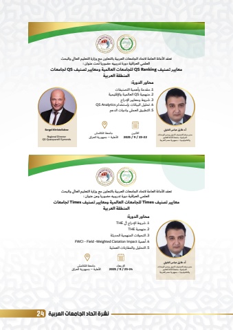 %u0646%u0634%u0631%u0629 %u0627%u062a%u062d%u0627%u062f %u0627%u0644%u062c%u0627%u0645%u0639%u0627%u062a %u0627%u0644%u0639%u0631%u0628%u064a%u0629 24%u0623.%u062f %u0637%u0627%u0631%u0642 %u0639%u0628%u0627%u0633 %u0627%u0644%u062e%u0648%u0644%u064a %u0645%u062f%u064a%u0631 %u0645%u0631%u0643%u0632 %u0627%u0644%u062a%u0635%u0646%u064a%u0641 %u0627%u0644%u062f%u0648%u0644%u064a %u0648%u0645%u062f%u064a%u0631 %u0627%u0644%u0648%u062d%u062f%u0627%u062a%u0627%u0644%u0645%u0631%u0643%u0632%u064a%u0629- %u062c%u0627%u0645%u0639%u0629 %u0627%u0644%u062f%u0644%u062a%u0627 %u0644%u0644%u0639%u0644%u0648%u0645%u0648%u0627%u0644%u062a%u0643%u0646%u0648%u0644%u0648%u062c%u064a%u0627 %u2013 %u062c%u0645%u0647%u0648%u0631%u064a%u0629 %u0645%u0635%u0631 %u0627%u0644%u0639%u0631%u0628%u064a%u0629Sergei KhristoliubovRegional DirectorQS Quacquarelli Symonds%u062a%u0639%u0642%u062f %u0627%u0644%u0623%u0645%u0627%u0646%u0629 %u0627%u0644%u0639%u0627%u0645%u0629 %u0644%u0627%u062a%u062d%u0627%u062f %u0627%u0644%u062c%u0627%u0645%u0639%u0627%u062a %u0627%u0644%u0639%u0631%u0628%u064a%u0629 %u0628%u0627%u0644%u062a%u0639%u0627%u0648%u0646 %u0645%u0639 %u0648%u0632%u0627%u0631%u0629 %u0627%u0644%u062a%u0639%u0644%u064a%u0645 %u0627%u0644%u0639%u0627%u0644%u064a %u0648%u0627%u0644%u0628%u062d%u062b%u0627%u0644%u0639%u0644%u0645%u064a %u0627%u0644%u0639%u0631%u0627%u0642%u064a%u0629 %u062f%u0648%u0631%u0629 %u062a%u062f%u0631%u064a%u0628%u064a%u0647 %u062d%u0636%u0648%u0631%u064a%u0627 %u062a%u062d%u062a %u0639%u0646%u0648%u0627%u0646 :%u0645%u0639%u0627%u064a%u064a%u0631 %u062a%u0635%u0646%u064a%u0641 Ranking QS %u0644%u0644%u062c%u0627%u0645%u0639%u0627%u062a %u0627%u0644%u0639%u0627%u0644%u0645%u064a%u0629 %u0648%u0645%u0639%u0627%u064a%u064a%u0631 %u062a%u0635%u0646%u064a%u0641 QS %u0644%u062c%u0627%u0645%u0639%u0627%u062a %u0627%u0644%u0645%u0646%u0637%u0642%u0629 %u0627%u0644%u0639%u0631%u0628%u064a%u0629%u0645%u062d%u0627%u0648%u0631 %u0627%u0644%u062f%u0648%u0631%u0629:1 .%u0645%u0642%u062f%u0645%u0629 %u0648%u0623%u0647%u0645%u064a%u0629 %u0627%u0644%u062a%u0635%u0646%u064a%u0641%u0627%u062a2 .%u0645%u0646%u0647%u062c%u064a%u0629 QS %u0627%u0644%u0639%u0627%u0644%u0645%u064a%u0629 %u0648%u0627%u0644%u0625%u0642%u0644%u064a%u0645%u064a%u06293 .%u0634%u0631%u0648%u0637 %u0648%u0645%u0639%u0627%u064a%u064a%u0631 %u0627%u0644%u0625%u062f%u0631%u0627%u062c4 .%u062a%u062d%u0644%u064a%u0644 %u0627%u0644%u0628%u064a%u0627%u0646%u0627%u062a %u0628%u0625%u0633%u062a%u062e%u062f%u0627%u0645 Analytics QS5 .%u0627%u0644%u062a%u0637%u0628%u064a%u0642 %u0627%u0644%u0639%u0645%u0644%u064a %u0648%u0627%u062f%u0648%u0627%u062a %u0627%u0644%u062f%u0639%u0645%u0627%u0644%u0627%u062b%u0646%u064a%u06462025 / 9 / 23-22%u062c%u0627%u0645%u0639%u0629 %u0643%u0644%u0643%u0627%u0645%u0634%u0627%u0644%u0623%u0647%u0644%u064a%u0629 %u2013 %u062c%u0645%u0647%u0648%u0631%u064a%u0629 %u0627%u0644%u0639%u0631%u0627%u0642%u0623.%u062f %u0637%u0627%u0631%u0642 %u0639%u0628%u0627%u0633 %u0627%u0644%u062e%u0648%u0644%u064a %u0645%u062f%u064a%u0631 %u0645%u0631%u0643%u0632 %u0627%u0644%u062a%u0635%u0646%u064a%u0641 %u0627%u0644%u062f%u0648%u0644%u064a %u0648%u0645%u062f%u064a%u0631 %u0627%u0644%u0648%u062d%u062f%u0627%u062a%u0627%u0644%u0645%u0631%u0643%u0632%u064a%u0629- %u062c%u0627%u0645%u0639%u0629 %u0627%u0644%u062f%u0644%u062a%u0627 %u0644%u0644%u0639%u0644%u0648%u0645%u0648%u0627%u0644%u062a%u0643%u0646%u0648%u0644%u0648%u062c%u064a%u0627 %u2013 %u062c%u0645%u0647%u0648%u0631%u064a%u0629 %u0645%u0635%u0631 %u0627%u0644%u0639%u0631%u0628%u064a%u0629%u062a%u0639%u0642%u062f %u0627%u0644%u0623%u0645%u0627%u0646%u0629 %u0627%u0644%u0639%u0627%u0645%u0629 %u0644%u0627%u062a%u062d%u0627%u062f %u0627%u0644%u062c%u0627%u0645%u0639%u0627%u062a %u0627%u0644%u0639%u0631%u0628%u064a%u0629 %u0628%u0627%u0644%u062a%u0639%u0627%u0648%u0646 %u0645%u0639 %u0648%u0632%u0627%u0631%u0629 %u0627%u0644%u062a%u0639%u0644%u064a%u0645 %u0627%u0644%u0639%u0627%u0644%u064a %u0648%u0627%u0644%u0628%u062d%u062b%u0627%u0644%u0639%u0644%u0645%u064a %u0627%u0644%u0639%u0631%u0627%u0642%u064a%u0629 %u062f%u0648%u0631%u0629 %u062a%u062f%u0631%u064a%u0628%u064a%u0647 %u062d%u0636%u0648%u0631%u064a%u0627 %u0648%u0639%u0646 %u0639%u0646%u0648%u0627%u0646 :%u0645%u0639%u0627%u064a%u064a%u0631 %u062a%u0635%u0646%u064a%u0641 Times %u0644%u0644%u062c%u0627%u0645%u0639%u0627%u062a %u0627%u0644%u0639%u0627%u0644%u0645%u064a%u0629 %u0648%u0645%u0639%u0627%u064a%u064a%u0631 %u062a%u0635%u0646%u064a%u0641 Times %u0644%u062c%u0627%u0645%u0639%u0627%u062a %u0627%u0644%u0645%u0646%u0637%u0642%u0629 %u0627%u0644%u0639%u0631%u0628%u064a%u0629%u0627%u0644%u0627%u0631%u0628%u0639%u0627%u06212025 / 9 / 25-24%u062c%u0627%u0645%u0639%u0629 %u0643%u0644%u0643%u0627%u0645%u0634%u0627%u0644%u0623%u0647%u0644%u064a%u0629 %u2013 %u062c%u0645%u0647%u0648%u0631%u064a%u0629 %u0627%u0644%u0639%u0631%u0627%u0642%u0645%u062d%u0627%u0648%u0631 %u0627%u0644%u062f%u0648%u0631%u0629:1 .%u0634%u0631%u0648%u0637 %u0627%u0644%u0625%u062f%u0631%u0627%u062c %u0641%u064a THETHE %u0645%u0646%u0647%u062c%u064a%u0629. 23 .%u0627%u0644%u062a%u062d%u0648%u0644%u0627%u062a %u0627%u0644%u0645%u0646%u0647%u062c%u064a%u0629 %u0627%u0644%u062d%u062f%u064a%u062b%u0629FWCI - Field -Weighted Ciatation Impact %u0623%u0647%u0645%u064a%u0629. 45 .%u0627%u0644%u062a%u062d%u0644%u064a%u0644 %u0648%u0627%u0644%u0645%u0642%u0627%u0631%u0646%u0627%u062a %u0627%u0644%u0639%u0645%u0644%u064a%u0629