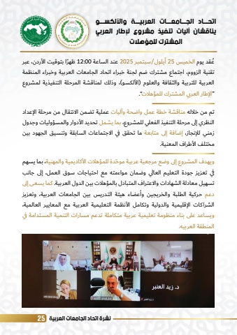%u0646%u0634%u0631%u0629 %u0627%u062a%u062d%u0627%u062f %u0627%u0644%u062c%u0627%u0645%u0639%u0627%u062a %u0627%u0644%u0639%u0631%u0628%u064a%u0629 25%u0627%u062a%u062d%u0640%u0640%u0640%u0627%u062f %u0627%u0644%u062c%u0640%u0640%u0640%u0627%u0645%u0639%u0640%u0640%u0640%u0627%u062a %u0627%u0644%u0639%u0631%u0628%u064a%u0640%u0640%u0640%u0629 %u0648%u0627%u0644%u0623%u0644%u0643%u0633%u0640%u0640%u0640%u0648%u064a%u0646%u0627%u0642%u0634%u0627%u0646 %u0622%u0644%u064a%u0627%u062a %u062a%u0646%u0641%u064a%u0630 %u0645%u0634%u0631%u0648%u0639 %u0644%u0625%u0637%u0627%u0631 %u0627%u0644%u0639%u0631%u0628%u064a %u0627%u0644%u0645%u0634%u062a%u0631%u0643 %u0644%u0644%u0645%u0624%u0647%u0644%u0627%u062a%u064f%u0639%u0642%u062f %u064a%u0648%u0645 %u0627%u0644%u062e%u0645%u064a%u0633 25 %u0623%u064a%u0644%u0648%u0644/%u0633%u0628%u062a%u0645%u0628%u0631 2025 %u0639%u0646%u062f %u0627%u0644%u0633%u0627%u0639%u0629 00:12 %u064b %u0638%u0647%u0631%u0627 %u0628%u062a%u0648%u0642%u064a%u062a %u0627%u0644%u0623%u0631%u062f%u0646%u060c %u0639%u0628%u0631 %u062a%u0642%u0646%u064a%u0629 %u0627%u0644%u0632%u0648%u0648%u0645%u060c %u0627%u062c%u062a%u0645%u0627%u0639 %u0645%u0634%u062a%u0631%u0643 %u0636%u0645 %u0644%u062c%u0646%u0629 %u062e%u0628%u0631%u0627%u0621 %u0627%u062a%u062d%u0627%u062f %u0627%u0644%u062c%u0627%u0645%u0639%u0627%u062a %u0627%u0644%u0639%u0631%u0628%u064a%u0629 %u0648%u062e%u0628%u0631%u0627%u0621 %u0627%u0644%u0645%u0646%u0638%u0645%u0629 %u0627%u0644%u0639%u0631%u0628%u064a%u0629 %u0644%u0644%u062a%u0631%u0628%u064a%u0629 %u0648%u0627%u0644%u062b%u0642%u0627%u0641%u0629 %u0648%u0627%u0644%u0639%u0644%u0648%u0645 (%u0627%u0644%u0623%u0644%u0643%u0633%u0648)%u060c %u0648%u0630%u0644%u0643 %u0644%u0645%u0646%u0627%u0642%u0634%u0629 %u0627%u0644%u0645%u0631%u062d%u0644%u0629 %u0627%u0644%u062a%u0646%u0641%u064a%u0630%u064a%u0629 %u0644%u0645%u0634%u0631%u0648%u0639 %u201c%u0627%u0644%u0625%u0637%u0627%u0631 %u0627%u0644%u0639%u0631%u0628%u064a %u0627%u0644%u0645%u0634%u062a%u0631%u0643 %u0644%u0644%u0645%u0624%u0647%u0644%u0627%u062a%u201d.%u062a%u0645 %u0645%u0646 %u062e%u0644%u0627%u0644%u0647 %u0645%u0646%u0627%u0642%u0634%u0629 %u062e%u0637%u0629 %u0639%u0645%u0644 %u0648%u0627%u0636%u062d%u0629 %u0648%u0622%u0644%u064a%u0627%u062a %u0639%u0645%u0644%u064a%u0629 %u062a%u0636%u0645%u0646 %u0627%u0644%u0627%u0646%u062a%u0642%u0627%u0644 %u0645%u0646 %u0645%u0631%u062d%u0644%u0629 %u0627%u0644%u0625%u0639%u062f%u0627%u062f %u0627%u0644%u0646%u0638%u0631%u064a %u0625%u0644%u0649 %u0645%u0631%u062d%u0644%u0629 %u0627%u0644%u062a%u0646%u0641%u064a%u0630 %u0627%u0644%u0641%u0639%u0644%u064a %u0644%u0644%u0645%u0634%u0631%u0648%u0639%u060c %u0628%u0645%u0627 %u064a%u0634%u0645%u0644 %u062a%u062d%u062f%u064a%u062f %u0627%u0644%u0623%u062f%u0648%u0627%u0631 %u0648%u0627%u0644%u0645%u0633%u0624%u0648%u0644%u064a%u0627%u062a %u0648%u062c%u062f%u0648%u0644 %u0632%u0645%u0646%u064a %u0644%u0644%u0625%u0646%u062c%u0627%u0632%u060c %u0625%u0636%u0627%u0641%u0629 %u0625%u0644%u0649 %u0645%u062a%u0627%u0628%u0639%u0629 %u0645%u0627 %u062a%u062d%u0642%u0642 %u0641%u064a %u0627%u0644%u0627%u062c%u062a%u0645%u0627%u0639%u0627%u062a %u0627%u0644%u0633%u0627%u0628%u0642%u0629 %u0648%u062a%u0646%u0633%u064a%u0642 %u0627%u0644%u062c%u0647%u0648%u062f %u0628%u064a%u0646 %u0645%u062e%u062a%u0644%u0641 %u0627%u0644%u0623%u0637%u0631%u0627%u0641 %u0627%u0644%u0645%u0639%u0646%u064a%u0629.%u0648%u064a%u0647%u062f%u0641 %u0627%u0644%u0645%u0634%u0631%u0648%u0639 %u0625%u0644 %u0651 %u0649 %u0648%u0636%u0639 %u0645%u0631%u062c%u0639%u064a%u0629 %u0639%u0631%u0628%u064a%u0629 %u0645%u0648%u062d%u062f%u0629 %u0644%u0644%u0645%u0624%u0647%u0644%u0627%u062a %u0627%u0644%u0623%u0643%u0627%u062f%u064a%u0645%u064a%u0629 %u0648%u0627%u0644%u0645%u0647%u0646%u064a%u0629%u060c %u0628%u0645%u0627 %u064a%u0633%u0647%u0645 %u0641%u064a %u062a%u0639%u0632%u064a%u0632 %u062c%u0648%u062f%u0629 %u0627%u0644%u062a%u0639%u0644%u064a%u0645 %u0627%u0644%u0639%u0627%u0644%u064a %u0648%u0636%u0645%u0627%u0646 %u0645%u0648%u0627%u0621%u0645%u062a%u0647 %u0645%u0639 %u0627%u062d%u062a%u064a%u0627%u062c%u0627%u062a %u0633%u0648%u0642 %u0627%u0644%u0639%u0645%u0644%u060c %u0625%u0644%u0649 %u062c%u0627%u0646%u0628 %u062a%u0633%u0647%u064a%u0644 %u0645%u0639%u0627%u062f%u0644%u0629 %u0627%u0644%u0634%u0647%u0627%u062f%u0627%u062a %u0648%u0627%u0644%u0627%u0639%u062a%u0631%u0627%u0641 %u0627%u0644%u0645%u062a%u0628%u0627%u062f%u0644 %u0628%u0627%u0644%u0645%u0624%u0647%u0644%u0627%u062a %u0628%u064a%u0646 %u0627%u0644%u062f%u0648%u0644 %u0627%u0644%u0639%u0631%u0628%u064a%u0629. %u0643%u0645%u0627 %u064a%u0633%u0639%u0649 %u0625%u0644%u0649 %u062f%u0639%u0645 %u062d%u0631%u0643%u064a%u0629 %u0627%u0644%u0637%u0644%u0628%u0629 %u0648%u0627%u0644%u062e%u0631%u064a%u062c%u064a%u0646 %u0648%u0623%u0639%u0636%u0627%u0621 %u0647%u064a%u0626%u0629 %u0627%u0644%u062a%u062f%u0631%u064a%u0633 %u0628%u064a%u0646 %u0627%u0644%u062c%u0627%u0645%u0639%u0627%u062a %u0627%u0644%u0639%u0631%u0628%u064a%u0629%u060c %u0648%u062a%u0639%u0632%u064a%u0632 %u0627%u0644%u0634%u0631%u0627%u0643%u0627%u062a %u0627%u0644%u0625%u0642%u0644%u064a%u0645%u064a%u0629 %u0648%u0627%u0644%u062f%u0648%u0644%u064a%u0629 %u0648%u062a%u0643%u0627%u0645%u0644 %u0627%u0644%u0623%u0646%u0638%u0645%u0629 %u0627%u0644%u062a%u0639%u0644%u064a%u0645%u064a%u0629 %u0627%u0644%u0639%u0631%u0628%u064a%u0629 %u0645%u0639 %u0627%u0644%u0645%u0639%u0627%u064a%u064a%u0631 %u0627%u0644%u0639%u0627%u0644%u0645%u064a%u0629%u060c %u0648%u064a%u0633%u0627%u0639%u062f %u0639%u0644%u0649 %u0628%u0646%u0627%u0621 %u0645%u0646%u0638%u0648%u0645%u0629 %u062a%u0639%u0644%u064a%u0645%u064a%u0629 %u0639%u0631%u0628%u064a%u0629 %u0645%u062a%u0643%u0627%u0645%u0644%u0629 %u062a%u062f%u0639%u0645 %u0645%u0633%u0627%u0631%u0627%u062a %u0627%u0644%u062a%u0646%u0645%u064a%u0629 %u0627%u0644%u0645%u0633%u062a%u062f%u0627%u0645%u0629 %u0641%u064a %u0627%u0644%u0645%u0646%u0637%u0642%u0629 %u0627%u0644%u0639%u0631