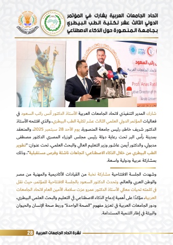 %u0646%u0634%u0631%u0629 %u0627%u062a%u062d%u0627%u062f %u0627%u0644%u062c%u0627%u0645%u0639%u0627%u062a %u0627%u0644%u0639%u0631%u0628%u064a%u0629 28%u0627%u062a%u062d%u0627%u062f %u0627%u0644%u062c%u0627%u0645%u0639%u0627%u062a %u0627%u0644%u0639%u0631%u0628%u064a%u0629 %u064a%u0634%u0627%u0631%u0643 %u0641%u064a %u0627%u0644%u0645%u0624%u062a%u0645%u0631 %u0627%u0644%u062f%u0648%u0644%u064a %u0627%u0644%u062b%u0627%u0644%u062b %u0639%u0634%u0631 %u0644%u0640%u0643%u0640%u0644%u0640%u064a%u0640%u0629 %u0627%u0644%u0640%u0637%u0640%u0628 %u0627%u0644%u0640%u0628%u0640%u064a%u0640%u0637%u0640%u0631%u064a %u0628%u0640%u062c%u0640%u0627%u0645%u0640%u0639%u0640%u0629 %u0627%u0644%u0640%u0645%u0640%u0646%u0640%u0635%u0640%u0648%u0631%u0629 %u062d%u0648%u0644 %u0627%u0644%u0630%u0643%u0627%u0621 %u0627%u0644%u0627%u0635%u0637%u0646%u0627%u0639%u064a%u0634%u0627%u0631%u0643 %u0627%u0644%u0645%u062f%u064a%u0631 %u0627%u0644%u062a%u0646%u0641%u064a%u0630%u064a %u0644%u0627%u062a%u062d%u0627%u062f %u0627%u0644%u062c%u0627%u0645%u0639%u0627%u062a %u0627%u0644%u0639%u0631%u0628%u064a%u0629 %u0627%u0644%u0623%u0633%u062a%u0627%u0630 %u0627%u0644%u062f%u0643%u062a%u0648%u0631 %u0623%u0646%u0633 %u0631%u0627%u062a%u0628 %u0627%u0644%u0633%u0639%u0648%u062f %u0641%u064a %u0641%u0639%u0627%u0644%u064a%u0627%u062a %u0627%u0644%u0645%u0624%u062a%u0645%u0631 %u0627%u0644%u062f%u0648%u0644%u064a %u0627%u0644%u0639%u0644%u0645%u064a %u0627%u0644%u062b%u0627%u0644%u062b %u0639%u0634%u0631 %u0644%u0643%u0644%u064a%u0629 %u0627%u0644%u0637%u0628 %u0627%u0644%u0628%u064a%u0637%u0631%u064a%u060c %u0648%u0627%u0644%u0630%u064a %u0627%u0641%u062a%u062a%u062d%u0647 %u0627%u0644%u0623%u0633%u062a%u0627%u0630 %u0627%u0644%u062f%u0643%u062a%u0648%u0631 %u0634%u0631%u064a%u0641 %u062e%u0627%u0637%u0631%u060c %u0631%u0626%u064a%u0633 %u062c%u0627%u0645%u0639%u0629 %u0627%u0644%u0645%u0646%u0635%u0648%u0631%u0629%u060c %u064a%u0648%u0645 %u0627%u0644%u0623%u062d%u062f 28 %u0633%u0628%u062a%u0645%u0628%u0631 2025 %u060c%u0648%u0627%u0644%u0645%u0646%u0639%u0642%u062f %u0628%u0645%u062f%u064a%u0646%u0629 %u0631%u0623%u0633 %u0627%u0644%u0628%u0631 %u062a%u062d%u062a %u0631%u0639%u0627%u064a%u0629 %u062f%u0648%u0644%u0629 %u0631%u0626%u064a%u0633 %u0645%u062c%u0644%u0633 %u0627%u0644%u0648%u0632%u0631%u0627%u0621 %u0627%u0644%u0645%u0635%u0631%u064a %u0627%u0644%u062f%u0643%u062a%u0648%u0631 %u0645%u0635%u0637%u0641%u0649 %u0645%u062f%u0628%u0648%u0644%u064a%u060c %u0648%u0627%u0644%u062f%u0643%u062a%u0648%u0631 %u0623%u064a%u0645%u0646 %u0639%u0627%u0634%u0648%u0631 %u0648%u0632%u064a%u0631 %u0627%u0644%u062a%u0639%u0644%u064a%u0645 %u0627%u0644%u0639%u0627%u0644%u064a %u0648%u0627%u0644%u0628%u062d%u062b %u0627%u0644%u0639%u0644%u0645%u064a%u060c %u062a%u062d%u062a %u0639%u0646%u0648%u0627%u0646: %u201d%u062a%u0637%u0648%u064a%u0631 %u0627%u0644%u0637%u0628 %u0627%u0644%u0628%u064a%u0637%u0631%u064a %u0645%u0646 %u062e%u0644%u0627%u0644 %u0627%u0644%u0630%u0643%u0627%u0621 %u0627%u0644%u0627%u0635%u0637%u0646%u0627%u0639%u064a: %u0627%u062a%u062c%u0627%u0647%u0627%u062a %u0646%u0627%u0634%u0626%u0629 %u0648%u0641%u0631%u0635 %u0645%u0633%u062a%u0642%u0628%u0644%u064a%u0629%u201c%u060c %u0648%u0630%u0644%u0643 %u0628%u0645%u0634%u0627%u0631%u0643%u0629 %u0639%u0631%u0628%u064a%u0629 %u0648%u062f%u0648%u0644%u064a%u0629 %u0648%u0627%u0633%u0639%u0629.%u0648%u0634%u0647%u062f%u062a %u0627%u0644%u062c%u0644%u0633%u0629 %u0627%u0644%u0627%u0641%u062a%u062a%u0627%u062d%u064a%u0629 %u0645%u0634%u0627%u0631%u0643%u0629 %u0646%u062e%u0628%u0629 %u0645%u0646 %u0627%u0644%u0642%u064a%u0627%u062f%u0627%u062a %u0627%u0644%u0623%u0643%u0627%u062f%u064a%u0645%u064a%u0629 %u0648%u0627%u0644%u0645%u0647%u0646%u064a%u0629 %u0645%u0646 %u0645%u0635%u0631 %u0648%u0627%u0644%u0648%u0637%u0646 %u0627%u0644%u0639%u0631%u0628%u064a %u0648%u0627%u0644%u0639%u0627%u0644%u0645. %u0648%u062a%u062d%u062f%u062b %u0627%u0644%u062f%u0643%u062a%u0648%u0631 %u0627%u0644%u0633%u0639%u0648%u062f %u0628%u0627%u0644%u062c%u0644%u0633%u0629 %u0627%u0644%u0627%u0641%u062a%u062a%u0627%u062d%u064a%u0629 %u0644%u0644%u0645%u0624%u062a%u0645%u0631%u060c %u062d%u064a%u062b %u0646%u0642%u0644 %u0641%u064a %u0643%u0644%u0645%u062a%u0647 %u062a%u062d%u064a%u0627%u062a %u0645%u0639%u0627%u0644%u064a %u0627%u0644%u0623%u0633%u062a%u0627%u0630 %u0627%u0644%u062f%u0643%u062a%u0648%u0631 %u0639%u0645%u0631%u0648 %u0639%u0632%u062a %u0633%u0644%u0627%u0645%u0629%u060c %u0627%u0644%u0623%u0645%u064a%u0646 %u0627%u0644%u0639%u0627%u0645 %u0644%u0627%u062a%u062d%u0627%u062f %u0627%u0644%u062c%u0627%u0645%u0639%u0627%u062a %u0627%u0644%u0639%u0631%u0628%u064a%u0629 %u064b %u060c %u0645%u0624%u0643%u062f%u0627 %u0639%u0644%u0649 %u0623%u0647%u0645%u064a%u0629 %u0625%u062f%u0645%u0627%u062c %u0627%u0644%u0630%u0643%u0627%u0621 %u0627%u0644%u0627%u0635%u0637%u0646%u0627%u0639%u064a %u0641%u064a %u0627%u0644%u062a%u0639%u0644%u064a%u0645 %u0648%u0627%u0644%u0628%u062d%u062b %u0627%u0644%u0639%u0644%u0645%u064a %u0627%u0644%u0628%u064a%u0637%u0631%u064a%u060c %u0648%u062f%u0648%u0631 %u0627%u0644%u062c%u0627%u0645%u0639%u0627%u062a %u0627%u0644%u0639%u0631%u0628%u064a%u0629 %u0641%u064a %u062a%u0639%u0632%u064a%u0632 %u0645%u0641%u0647%u0648%u0645 %u201c%u0627%u0644%u0635%u062d%u0629 %u0627%u0644%u0648%u0627%u062d%u062f%u0629%u201d %u0648%u0631%u0628%u0637 %u0635%u062d%u0629 %u0627%u0644%u0625%u0646%u0633%u0627%u0646 %u0648%u0627%u0644%u062d%u064a%u0648%u0627%u0646 %u0648%u0627%u0644%u0628%u064a%u0626%u0629 %u0641%u064a %u0625%u0637%u0627%u0631 %u0627%u0644%u062a%u0646%u0645%u064a%u0629 %u0627%u0644%u0645%u0633%u062a%u062f%u0627%u0645%u0629.