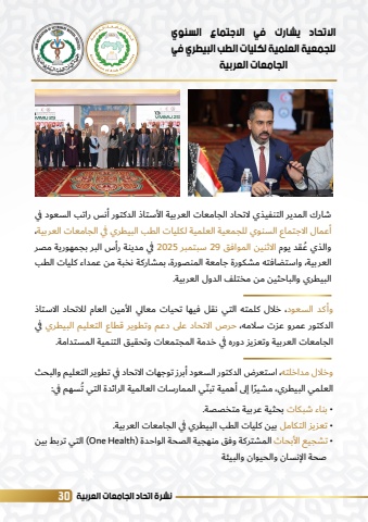 %u0627%u0644%u0627%u062a%u062d%u0627%u062f %u064a%u0634%u0627%u0631%u0643 %u0641%u064a %u0627%u0644%u0627%u062c%u062a%u0645%u0627%u0639 %u0627%u0644%u0633%u0646%u0648%u064a %u0644%u0644%u062c%u0645%u0639%u064a%u0629 %u0627%u0644%u0639%u0644%u0645%u064a%u0629 %u0644%u0643%u0644%u064a%u0627%u062a %u0627%u0644%u0637%u0628 %u0627%u0644%u0628%u064a%u0637%u0631%u064a %u0641%u064a %u0627%u0644%u062c%u0627%u0645%u0639%u0627%u062a %u0627%u0644%u0639%u0631%u0628%u064a%u0629%u0646%u0634%u0631%u0629 %u0627%u062a%u062d%u0627%u062f %u0627%u0644%u062c%u0627%u0645%u0639%u0627%u062a %u0627%u0644%u0639%u0631%u0628%u064a%u0629 30%u0648%u0623%u0643%u062f %u0627%u0644%u0633%u0639%u0648%u062f%u060c %u062e%u0644%u0627%u0644 %u0643%u0644%u0645%u062a%u0647 %u0627%u0644%u062a%u064a %u0646%u0642%u0644 %u0641%u064a%u0647%u0627 %u062a%u062d%u064a%u0627%u062a %u0645%u0639%u0627%u0644%u064a %u0627%u0644%u0623%u0645%u064a%u0646 %u0627%u0644%u0639%u0627%u0645 %u0644%u0644%u0627%u062a%u062d%u0627%u062f %u0627%u0644%u0627%u0633%u062a%u0627%u0630 %u0627%u0644%u062f%u0643%u062a%u0648%u0631 %u0639%u0645%u0631%u0648 %u0639%u0632%u062a %u0633%u0644%u0627%u0645%u0647%u060c %u062d%u0631%u0635 %u0627%u0644%u0627%u062a%u062d%u0627%u062f %u0639%u0644%u0649 %u062f%u0639%u0645 %u0648%u062a%u0637%u0648%u064a%u0631 %u0642%u0637%u0627%u0639 %u0627%u0644%u062a%u0639%u0644%u064a%u0645 %u0627%u0644%u0628%u064a%u0637%u0631%u064a %u0641%u064a %u0627%u0644%u062c%u0627%u0645%u0639%u0627%u062a %u0627%u0644%u0639%u0631%u0628%u064a%u0629 %u0648%u062a%u0639%u0632%u064a%u0632 %u062f%u0648%u0631%u0647 %u0641%u064a %u062e%u062f%u0645%u0629 %u0627%u0644%u0645%u062c%u062a%u0645%u0639%u0627%u062a %u0648%u062a%u062d%u0642%u064a%u0642 %u0627%u0644%u062a%u0646%u0645%u064a%u0629 %u0627%u0644%u0645%u0633%u062a%u062f%u0627%u0645%u0629.%u2022 %u0628%u0646%u0627%u0621 %u0634%u0628%u0643%u0627%u062a %u0628%u062d%u062b%u064a%u0629 %u0639%u0631%u0628%u064a%u0629 %u0645%u062a%u062e%u0635%u0635%u0629.%u2022 %u062a%u0639%u0632%u064a%u0632 %u0627%u0644%u062a%u0643%u0627%u0645%u0644 %u0628%u064a%u0646 %u0643%u0644%u064a%u0627%u062a %u0627%u0644%u0637%u0628 %u0627%u0644%u0628%u064a%u0637%u0631%u064a %u0641%u064a %u0627%u0644%u062c%u0627%u0645%u0639%u0627%u062a %u0627%u0644%u0639%u0631%u0628%u064a%u0629.%u2022 %u062a%u0634%u062c%u064a%u0639 %u0627%u0644%u0623%u0628%u062d%u0627%u062b %u0627%u0644%u0645%u0634%u062a%u0631%u0643%u0629 %u0648%u0641%u0642 %u0645%u0646%u0647%u062c%u064a%u0629 %u0627%u0644%u0635%u062d%u0629 %u0627%u0644%u0648%u0627%u062d%u062f%u0629 (Health One (%u0627%u0644%u062a%u064a %u062a%u0631%u0628%u0637 %u0628%u064a%u0646 %u0635%u062d%u0629 %u0627%u0644%u0625%u0646%u0633%u0627%u0646 %u0648%u0627%u0644%u062d%u064a%u0648%u0627%u0646 %u0648%u0627%u0644%u0628%u064a%u0626%u0629%u0648%u062e%u0644%u0627%u0644 %u0645%u062f%u0627%u062e%u0644%u062a%u0647%u060c %u0627%u0633%u062a%u0639%u0631%u0636 %u0627%u0644%u062f%u0643%u062a%u0648%u0631 %u0627%u0644%u0633%u0639%u0648%u062f %u0623%u0628%u0631%u0632 %u062a%u0648%u062c%u0647%u0627%u062a %u0627%u0644%u0627%u062a%u062d%u0627%u062f %u0641%u064a %u062a%u0637%u0648%u064a%u0631 %u0627%u0644%u062a%u0639%u0644%u064a%u0645 %u0648%u0627%u0644%u0628%u062d%u062b %u064b %u0627%u0644%u0639%u0644%u0645%u064a %u0627%u0644%u0628%u064a%u0637%u0631%u064a%u060c %u0645%u0634%u064a%u0631%u0627 %u0625%u0644 %u0651 %u0649 %u0623%u0647%u0645%u064a%u0629 %u062a%u0628%u0646 %u064f %u064a %u0627%u0644%u0645%u0645%u0627%u0631%u0633%u0627%u062a %u0627%u0644%u0639%u0627%u0644%u0645%u064a%u0629 %u0627%u0644%u0631%u0627%u0626%u062f%u0629 %u0627%u0644%u062a%u064a %u062a%u0633%u0647%u0645 %u0641%u064a:%u0634%u0627%u0631%u0643 %u0627%u0644%u0645%u062f%u064a%u0631 %u0627%u0644%u062a%u0646%u0641%u064a%u0630%u064a %u0644%u0627%u062a%u062d%u0627%u062f %u0627%u0644%u062c%u0627%u0645%u0639%u0627%u062a %u0627%u0644%u0639%u0631%u0628%u064a%u0629 %u0627%u0644%u0623%u0633%u062a%u0627%u0630 %u0627%u0644%u062f%u0643%u062a%u0648%u0631 %u0623%u0646%u0633 %u0631%u0627%u062a%u0628 %u0627%u0644%u0633%u0639%u0648%u062f %u0641%u064a %u0623%u0639%u0645%u0627%u0644 %u0627%u0644%u0627%u062c%u062a%u0645%u0627%u0639 %u0627%u0644%u0633%u0646%u0648%u064a %u0644%u0644%u062c%u0645%u0639%u064a%u0629 %u0627%u0644%u0639%u0644%u0645%u064a%u0629 %u0644%u0643%u0644%u064a%u0627%u062a %u0627%u0644%u0637%u0628 %u0627%u0644%u0628%u064a%u0637%u0631%u064a %u0641%u064a %u0627%u0644%u062c%u0627%u0645%u0639%u0627%u062a %u0627%u0644%u0639%u0631%u0628%u064a%u0629%u060c %u064f %u0648%u0627%u0644%u0630%u064a %u0639%u0642%u062f %u064a%u0648%u0645 %u0627%u0644%u0627%u062b%u0646%u064a%u0646 %u0627%u0644%u0645%u0648%u0627%u0641%u0642 29 %u0633%u0628%u062a%u0645%u0628%u0631 2025 %u0641%u064a %u0645%u062f%u064a%u0646%u0629 %u0631%u0623%u0633 %u0627%u0644%u0628%u0631 %u0628%u062c%u0645%u0647%u0648%u0631%u064a%u0629 %u0645%u0635%u0631 %u0627%u0644%u0639%u0631%u0628%u064a%u0629%u060c %u0648%u0627%u0633%u062a%u0636%u0627%u0641%u062a%u0647 %u0645%u0634%u0643%u0648%u0631%u0629 %u062c%u0627%u0645%u0639%u0629 %u0627%u0644%u0645%u0646%u0635%u0648%u0631%u0629%u060c %u0628%u0645%u0634%u0627%u0631%u0643%u0629 %u0646%u062e%u0628%u0629 %u0645%u0646 %u0639%u0645%u062f%u0627%u0621 %u0643%u0644%u064a%u0627%u062a %u0627%u0644%u0637%u0628 %u0627%u0644%u0628%u064a%u0637%u0631%u064a %u0648%u0627%u0644%u0628%u0627%u062d%u062b%u064a%u0646 %u0645%u0646 %u0645%u062e%u062a%u0644%u0641 %u0627%u0644%u062f%u0648%u0644 %u0627%u0644%u0639%u0631%u0628%u064a%u0629.