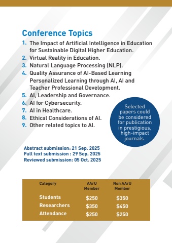 The Impact of Artificial Intelligence in Education for Sustainable Digital Higher Education.Virtual Reality in Education.Natural Language Processing (NLP).Quality Assurance of AI-Based Learning Personalized Learning through AI, AI and Teacher Professional Development.AI, Leadership and Governance.AI for Cybersecurity.AI in Healthcare.Ethical Considerations of AI.Other related topics to AI.Conference Topics1.2.3.4.5.6.7.8.9.CategoryStudentsResearchersAttendanceAArUMember$250$350$250Non AArUMember$350$450$250Selected papers could be considered for publication in prestigious, high-impact journals.Abstract submission: 21 Sep. 2025Full text submission : 29 Sep. 2025Reviewed submission: 05 Oct. 2025