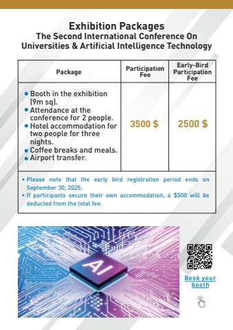 Exhibition PackagesThe Second International Conference OnUniversities & Artificial Intelligence TechnologyBooth in the exhibition (9m sq).Attendance at the conference for 2 people.Hotel accommodation for two people for three nights.Coffee breaks and meals.Airport transfer.3500 $ 2500 $Package ParticipationFeeEarly-BirdParticipationFee%u2022 Please note that the early bird registration period ends on September 30, 2025. %u2022 If participants secure their own accommodation, a $500 will be deducted from the total fee.