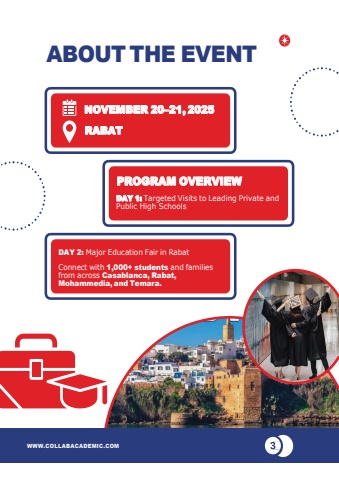 NOVEMBER 20%u201321, 2025RABATABOUT THE EVENTDAY 2: Major Education Fair in RabatConnect with 1,000+ students and familiesfrom across Casablanca, Rabat,Mohammedia, and Temara.WWW.COLLABACADEMIC.COMPROGRAM OVERVIEWDAY 1: Targeted Visits to Leading Private and Public High Schools