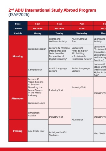 an 9-Jan 10-Jan 11-Jan 12-JanDhabi Dubai Abu Dhabi Abu Dhabi Abu Dhabisday Friday Saturday Sunday MondayWellness Campus TourAbu Dhabi tourGroup Presentation e urship, ement Lecture#6 %u201cLeadership Beyond Borders: Thriving in the Global Business Landscape%u201d%u201cBeyond ystifying Property e Digital Guest Lecture Certificate Appreciation Ceremony and Group Photosit Industry VisitSafari Trip Farewell LunchsitDubai tourtour