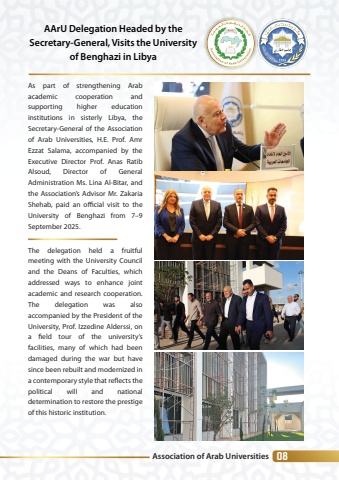 AArU Delegation Headed by theSecretary-General, Visits the Universityof Benghazi in LibyaAssociation of Arab Universities 08As part of strengthening Arab academic cooperation and supporting higher education institutions in sisterly Libya, the Secretary-General of the Association of Arab Universities, H.E. Prof. Amr Ezzat Salama, accompanied by the Executive Director Prof. Anas Ratib Alsoud, Director of General Administration Ms. Lina Al-Bitar, and the Association%u2019s Advisor Mr. Zakaria Shehab, paid an offlcial visit to the University of Benghazi from 7%u20139 September 2025.The delegation held a fruitful meeting with the University Council and the Deans of Faculties, which addressed ways to enhance joint academic and research cooperation. The delegation was also accompanied by the President of the University, Prof. Izzedine Alderssi, on a field tour of the university%u2019s facilities, many of which had been damaged during the war but have since been rebuilt and modernized in a contemporary style that reffiects the political will and national determination to restore the prestige of this historic institution.