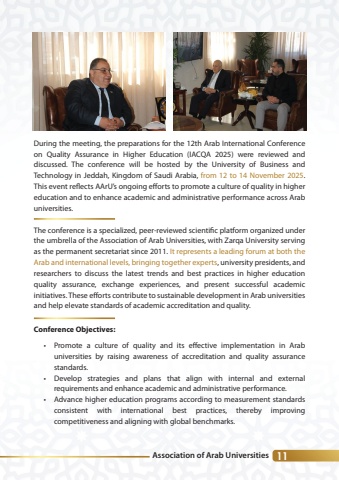 Association of Arab Universities 11During the meeting, the preparations for the 12th Arab International Conference on Quality Assurance in Higher Education (IACQA 2025) were reviewed and discussed. The conference will be hosted by the University of Business and Technology in Jeddah, Kingdom of Saudi Arabia, from 12 to 14 November 2025. This event reffiects AArU%u2019s ongoing efforts to promote a culture of quality in higher education and to enhance academic and administrative performance across Arab universities.The conference is a specialized, peer-reviewed scientific platform organized under the umbrella of the Association of Arab Universities, with Zarqa University serving as the permanent secretariat since 2011. It represents a leading forum at both the Arab and international levels, bringing together experts, university presidents, and researchers to discuss the latest trends and best practices in higher education quality assurance, exchange experiences, and present successful academic initiatives. These efforts contribute to sustainable development in Arab universities and help elevate standards of academic accreditation and quality.Conference Objectives:%u2022 Promote a culture of quality and its effective implementation in Arab universities by raising awareness of accreditation and quality assurance standards.%u2022 Develop strategies and plans that align with internal and external requirements and enhance academic and administrative performance.%u2022 Advance higher education programs according to measurement standards consistent with international best practices, thereby improving competitiveness and aligning with global benchmarks.