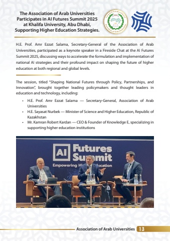 The Association of Arab UniversitiesParticipates in AI Futures Summit 2025at Khalifa University, Abu Dhabi,Supporting Higher Education Strategies.Association of Arab Universities 13H.E. Prof. Amr Ezzat Salama, Secretary-General of the Association of Arab Universities, participated as a keynote speaker in a Fireside Chat at the AI Futures Summit 2025, discussing ways to accelerate the formulation and implementation of national AI strategies and their profound impact on shaping the future of higher education at both regional and global levels.The session, titled %u201cShaping National Futures through Policy, Partnerships, and Innovation%u201d, brought together leading policymakers and thought leaders in education and technology, including:%u2022 H.E. Prof. Amr Ezzat Salama %u2014 Secretary-General, Association of Arab Universities%u2022 H.E. Sayasat Nurbek %u2014 Minister of Science and Higher Education, Republic of Kazakhstan%u2022 Mr. Kamran Robert Kardan %u2014 CEO & Founder of Knowledge E, specializing in supporting higher education institutions