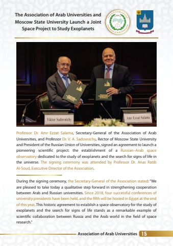 The Association of Arab Universities and Moscow State University Launch a Joint Space Project to Study ExoplanetsAssociation of Arab Universities 15Professor Dr. Amr Ezzat Salama, Secretary-General of the Association of Arab Universities, and Professor Dr. V. A. Sadovnichy, Rector of Moscow State University and President of the Russian Union of Universities, signed an agreement to launch a pioneering scientific project: the establishment of a Russian%u2013Arab space observatory dedicated to the study of exoplanets and the search for signs of life in the universe. The signing ceremony was attended by Professor Dr. Anas Ratib Al-Soud, Executive Director of the Association.During the signing ceremony, the Secretary-General of the Association stated: %u201cWe are pleased to take today a qualitative step forward in strengthening cooperation between Arab and Russian universities. Since 2018, four successful conferences of university presidents have been held, and the fifth will be hosted in Egypt at the end of this year. This historic agreement to establish a space observatory for the study of exoplanets and the search for signs of life stands as a remarkable example of scientific collaboration between Russia and the Arab world in the field of space research.%u201d