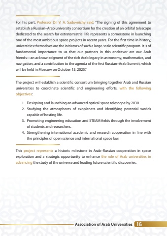 Association of Arab Universities 16For his part, Professor Dr. V. A. Sadovnichy said: %u201cThe signing of this agreement to establish a Russian%u2013Arab university consortium for the creation of an orbital telescope dedicated to the search for extraterrestrial life represents a cornerstone in launching one of the most ambitious space projects in recent years. For the first time in history, universities themselves are the initiators of such a large-scale scientific program. It is of fundamental importance to us that our partners in this endeavor are our Arab friends%u2014an acknowledgment of the rich Arab legacy in astronomy, mathematics, and navigation, and a contribution to the agenda of the first Russian%u2013Arab Summit, which will be held in Moscow on October 15, 2025.%u201dThe project will establish a scientific consortium bringing together Arab and Russian universities to coordinate scientific and engineering efforts, with the following objectives:1. Designing and launching an advanced optical space telescope by 2030.2. Studying the atmospheres of exoplanets and identifying potential worlds capable of hosting life.3. Promoting engineering education and STEAM fields through the involvement of students and researchers.4. Strengthening international academic and research cooperation in line with the principles of open science and international space law. This project represents a historic milestone in Arab%u2013Russian cooperation in space exploration and a strategic opportunity to enhance the role of Arab universities in advancing the study of the universe and leading future scientific discoveries.