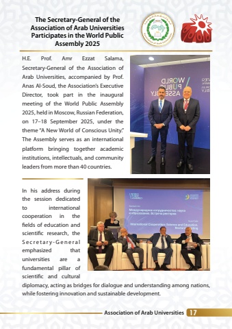 Association of Arab Universities 17H.E. Prof. Amr Ezzat Salama, Secretary-General of the Association of Arab Universities, accompanied by Prof. Anas Al-Soud, the Association%u2019s Executive Director, took part in the inaugural meeting of the World Public Assembly 2025, held in Moscow, Russian Federation, on 17%u201318 September 2025, under the theme %u201cA New World of Conscious Unity.%u201d The Assembly serves as an international platform bringing together academic institutions, intellectuals, and community leaders from more than 40 countries.In his address during the session dedicated to international cooperation in the fields of education and scientific research, the S e c r e t a r y - G e n e r a l emphasized that universities are a fundamental pillar of scientific and cultural diplomacy, acting as bridges for dialogue and understanding among nations, while fostering innovation and sustainable development.The Secretary-General of theAssociation of Arab UniversitiesParticipates in the World PublicAssembly 2025