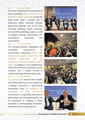 Association of Arab Universities 18He further noted that the Association of Arab Universities, which comprises more than 450 member universities across the Arab world, plays a pivotal role in advancing higher education through pioneering initiatives such as the Arab University Rankings, quality assurance and scientific publishing projects, as well as building strategic partnerships with international universities and organizations.The Secretary-General highlighted the remarkable achievements in Arab%u2013Russian cooperation, which have resulted in the signing of more than 200 academic agreements and the publication of hundreds of joint research papers, in addition to the establishment of branches of Russian universities in Arab countries, and a notable increase in student exchanges between both sides.In conclusion, he stressed that scientific and cultural diplomacy is not a luxury but a strategic necessity in a world facing accelerating crises. He reafflrmed the Association of Arab Universities%u2019 commitment to expanding international partnerships and strengthening the role of universities in shaping a future grounded in understanding, innovation, and shared human consciousness.