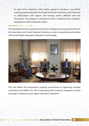 Association of Arab Universities 20%u2022 As part of the outcomes, both parties agreed to develop a specialized training program tailored to the needs of Somali universities, to be delivered in collaboration with experts and training centers afflliated with the Association. The program is intended to foster institutional and academic development with sustainable impact.The meeting focused on exploring avenues for strengthening cooperation between the Association and Somali National University, as well as expanding partnerships with Somali higher education institutions more broadly. This visit reffiects the Association%u2019s ongoing commitment to supporting member universities and reafflrms its role in promoting Arab academic integration and the exchange of expertise across higher education institutions.