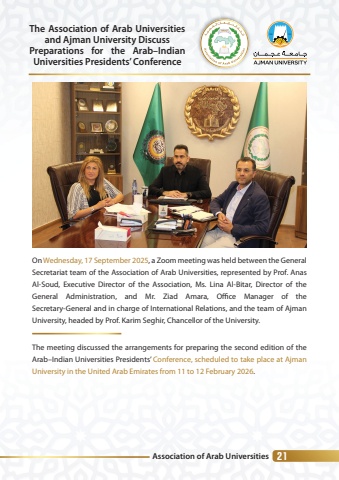 Association of Arab Universities 21The Association of Arab Universities and Ajman University DiscussPreparations for the Arab%u2013Indian Universities Presidents%u2019 ConferenceOn Wednesday, 17 September 2025, a Zoom meeting was held between the General Secretariat team of the Association of Arab Universities, represented by Prof. Anas Al-Soud, Executive Director of the Association, Ms. Lina Al-Bitar, Director of the General Administration, and Mr. Ziad Amara, Offlce Manager of the Secretary-General and in charge of International Relations, and the team of Ajman University, headed by Prof. Karim Seghir, Chancellor of the University.The meeting discussed the arrangements for preparing the second edition of the Arab%u2013Indian Universities Presidents%u2019 Conference, scheduled to take place at Ajman University in the United Arab Emirates from 11 to 12 February 2026.