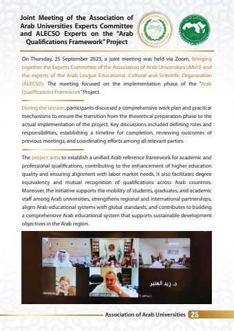 Association of Arab Universities 25On Thursday, 25 September 2025, a joint meeting was held via Zoom, bringing together the Experts Committee of the Association of Arab Universities (AArU) and the experts of the Arab League Educational, Cultural and Scientific Organization (ALECSO). The meeting focused on the implementation phase of the %u201cArab Qualifications Framework%u201d Project.During the session, participants discussed a comprehensive work plan and practical mechanisms to ensure the transition from the theoretical preparation phase to the actual implementation of the project. Key discussions included defining roles and responsibilities, establishing a timeline for completion, reviewing outcomes of previous meetings, and coordinating efforts among all relevant parties.The project aims to establish a unified Arab reference framework for academic and professional qualifications, contributing to the enhancement of higher education quality and ensuring alignment with labor market needs. It also facilitates degree equivalency and mutual recognition of qualifications across Arab countries. Moreover, the initiative supports the mobility of students, graduates, and academic staff among Arab universities, strengthens regional and international partnerships, aligns Arab educational systems with global standards, and contributes to building a comprehensive Arab educational system that supports sustainable development objectives in the Arab region.Joint Meeting of the Association ofArab Universities Experts Committeeand ALECSO Experts on the %u201cArabQualifications Framework%u201d Project