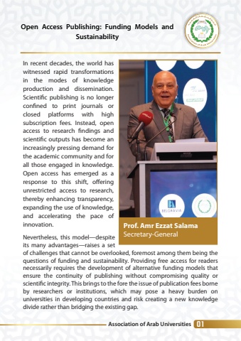 01Prof. Amr Ezzat SalamaSecretary-GeneralIn recent decades, the world has witnessed rapid transformations in the modes of knowledge production and dissemination. Scientific publishing is no longer confined to print journals or closed platforms with high subscription fees. Instead, open access to research findings and scientific outputs has become an increasingly pressing demand for the academic community and for all those engaged in knowledge. Open access has emerged as a response to this shift, offering unrestricted access to research, thereby enhancing transparency, expanding the use of knowledge, and accelerating the pace of innovation.Nevertheless, this model%u2014despite its many advantages%u2014raises a set of challenges that cannot be overlooked, foremost among them being the questions of funding and sustainability. Providing free access for readers necessarily requires the development of alternative funding models that ensure the continuity of publishing without compromising quality or scientific integrity. This brings to the fore the issue of publication fees borne by researchers or institutions, which may pose a heavy burden on universities in developing countries and risk creating a new knowledge divide rather than bridging the existing gap.Association of Arab UniversitiesOpen Access Publishing: Funding Models andSustainability