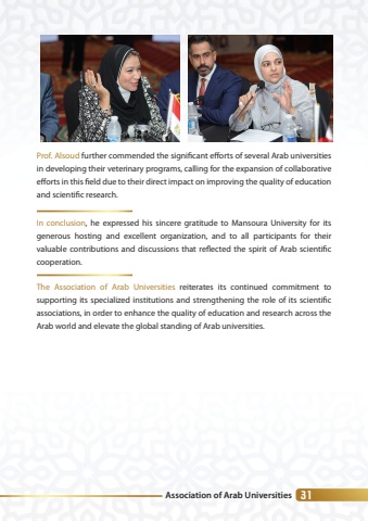 Association of Arab Universities 31Prof. Alsoud further commended the significant efforts of several Arab universities in developing their veterinary programs, calling for the expansion of collaborative efforts in this field due to their direct impact on improving the quality of education and scientific research.In conclusion, he expressed his sincere gratitude to Mansoura University for its generous hosting and excellent organization, and to all participants for their valuable contributions and discussions that reffiected the spirit of Arab scientific cooperation.The Association of Arab Universities reiterates its continued commitment to supporting its specialized institutions and strengthening the role of its scientific associations, in order to enhance the quality of education and research across the Arab world and elevate the global standing of Arab universities.