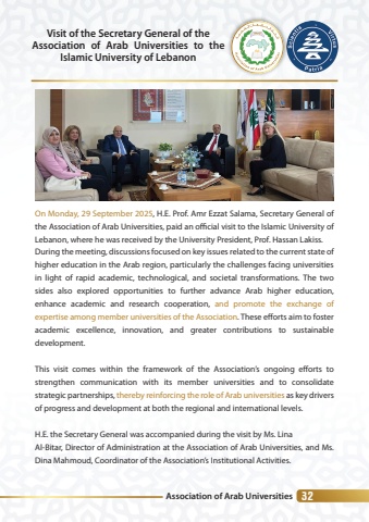 Association of Arab Universities 32Visit of the Secretary General of theAssociation of Arab Universities to the Islamic University of LebanonOn Monday, 29 September 2025, H.E. Prof. Amr Ezzat Salama, Secretary General of the Association of Arab Universities, paid an offlcial visit to the Islamic University of Lebanon, where he was received by the University President, Prof. Hassan Lakiss.During the meeting, discussions focused on key issues related to the current state of higher education in the Arab region, particularly the challenges facing universities in light of rapid academic, technological, and societal transformations. The two sides also explored opportunities to further advance Arab higher education, enhance academic and research cooperation, and promote the exchange of expertise among member universities of the Association. These efforts aim to foster academic excellence, innovation, and greater contributions to sustainable development.This visit comes within the framework of the Association%u2019s ongoing efforts to strengthen communication with its member universities and to consolidate strategic partnerships, thereby reinforcing the role of Arab universities as key drivers of progress and development at both the regional and international levels.H.E. the Secretary General was accompanied during the visit by Ms. Lina Al-Bitar, Director of Administration at the Association of Arab Universities, and Ms. Dina Mahmoud, Coordinator of the Association%u2019s Institutional Activities.
