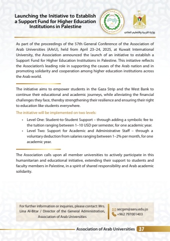 Association of Arab Universities 37Launching the Initiative to Establisha Support Fund for Higher EducationInstitutions in PalestineAs part of the proceedings of the 57th General Conference of the Association of Arab Universities (AArU), held from April 23%u201324, 2025, at Kuwait International University, the Association announced the launch of an initiative to establish a Support Fund for Higher Education Institutions in Palestine. This initiative reffiects the Association%u2019s leading role in supporting the causes of the Arab nation and in promoting solidarity and cooperation among higher education institutions across the Arab world.The initiative aims to empower students in the Gaza Strip and the West Bank to continue their educational and academic journeys, while alleviating the ffnancial challenges they face, thereby strengthening their resilience and ensuring their right to education like students everywhere.The initiative will be implemented on two levels:The Association calls upon all member universities to actively participate in this humanitarian and educational initiative, extending their support to students and faculty members in Palestine, in a spirit of shared responsibility and Arab academic solidarity.For further information or inquiries, please contact: Mrs. Lina Al-Bitar / Director of the General Administration, Association of Arab Universitiessecgen@aaru.edu.jo+962 797001403%u2022 Level One: Student-to-Student Support %u2013 through adding a symbolic fee to the tuition ranging between 1%u201310 USD per semester, for one academic year.%u2022 Level Two: Support for Academic and Administrative Staffl %u2013 through a voluntary deduction from salaries ranging between 1%u20132% per month, for one academic year.