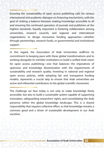 Association of Arab Universities 02Ensuring the sustainability of open access publishing calls for serious international and academic dialogue on financing mechanisms, with the goal of striking a balance between making knowledge accessible to all and ensuring the continued operation of journals and publishers at the highest standards. Equally important is fostering collaboration among universities, research councils, and regional and international organizations to design innovative funding approaches%u2014whether through partnerships, research funds, or governmental and institutional support.In this regard, the Association of Arab Universities reafflrms its commitment to keeping pace with these global transformations and to working alongside its member institutions to build a unified Arab vision for open access publishing%u2014one that balances the imperatives of openness and knowledge dissemination with the requirements of sustainability and research quality. Investing in national and regional open access policies, while adopting fair and transparent funding models, represents a crucial step to ensure that Arab universities are active and inffiuential contributors to the global scientific movement.The challenge we face today is not only to make knowledge freely accessible, but also to build a sustainable system capable of supporting innovation, safeguarding researchers%u2019 rights, and consolidating the Arab presence within the global knowledge landscape. This is a shared responsibility that requires collective effort, so that knowledge remains a common good and a driver of sustainable development in our Arab societies.