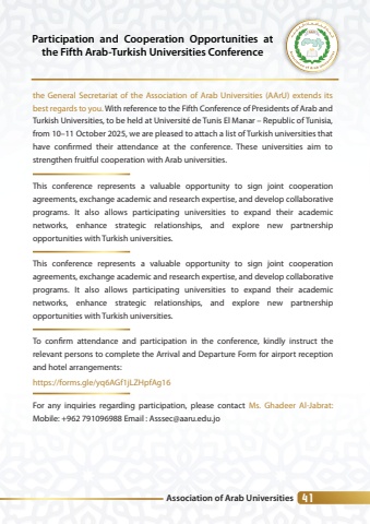 Association of Arab Universities 41the General Secretariat of the Association of Arab Universities (AArU) extends its best regards to you. With reference to the Fifth Conference of Presidents of Arab and Turkish Universities, to be held at Universit%u00e9 de Tunis El Manar %u2013 Republic of Tunisia, from 10%u201311 October 2025, we are pleased to attach a list of Turkish universities that have conffrmed their attendance at the conference. These universities aim to strengthen fruitful cooperation with Arab universities.This conference represents a valuable opportunity to sign joint cooperation agreements, exchange academic and research expertise, and develop collaborative programs. It also allows participating universities to expand their academic networks, enhance strategic relationships, and explore new partnership opportunities with Turkish universities.This conference represents a valuable opportunity to sign joint cooperation agreements, exchange academic and research expertise, and develop collaborative programs. It also allows participating universities to expand their academic networks, enhance strategic relationships, and explore new partnership opportunities with Turkish universities.To conffrm attendance and participation in the conference, kindly instruct the relevant persons to complete the Arrival and Departure Form for airport reception and hotel arrangements:https://forms.gle/yq6AGf1jLZHpfAg16For any inquiries regarding participation, please contact Ms. Ghadeer Al-Jabrat:Mobile: +962 791096988 Email : Asssec@aaru.edu.joParticipation and Cooperation Opportunities atthe Fifth Arab-Turkish Universities Conference