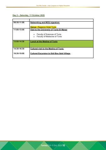 Day 2 %u2013 Saturday, 11 October 202509:30-11:00 Networking and MOU signatureVenue : Regency Hotel Tunis11:00-13:00 Visit to the University of Tunis El ManarFaculty of Sciences of TunisFaculty of Medecine of Tunis13:00-14:30 Lunch at the Medina of Tunis14:30-16:3016:30-19:00Cultural visit to the Medina of TunisCultural Excursion to Sidi Bou Said Village