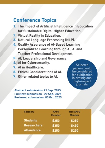 The Impact of Artificial Intelligence in Education for Sustainable Digital Higher Education.Virtual Reality in Education.Natural Language Processing (NLP).Quality Assurance of AI-Based Learning Personalized Learning through AI, AI and Teacher Professional Development.AI, Leadership and Governance.AI for Cybersecurity.AI in Healthcare.Ethical Considerations of AI.Other related topics to AI.Conference Topics1.2.3.4.5.6.7.8.9.CategoryStudentsResearchersAttendanceAArUMember$250$350$250Non AArUMember$350$450$250Selected papers could be considered for publication in prestigious, high-impact journals.Abstract submission: 21 Sep. 2025Full text submission : 29 Sep. 2025Reviewed submission: 05 Oct. 2025