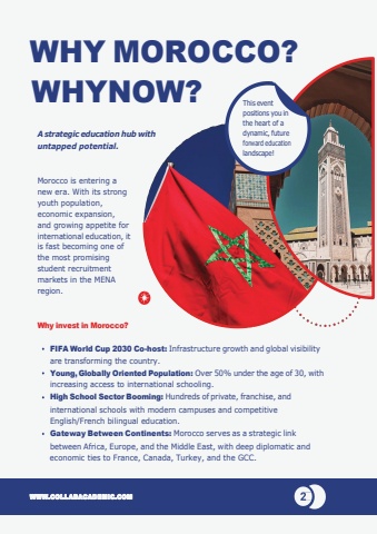 WHY MOROCCO?WHYNOW?A strategic education hub withuntapped potential.This event positions you inthe heart of adynamic, futureforward educationlandscape!Morocco is entering a new era. With its strongyouth population,economic expansion,and growing appetite for international education, itis fast becoming one of the most promisingstudent recruitmentmarkets in the MENAregion.Why invest in Morocco?FIFA World Cup 2030 Co-host: Infrastructure growth and global visibility are transforming the country.Young, Globally Oriented Population: Over 50% under the age of 30, withincreasing access to international schooling.High School Sector Booming: Hundreds of private, franchise, andinternational schools with modern campuses and competitive English/French bilingual education.Gateway Between Continents: Morocco serves as a strategic link between Africa, Europe, and the Middle East, with deep diplomatic andeconomic ties to France, Canada, Turkey, and the GCC.WWW.COLLABACADEMIC.COM