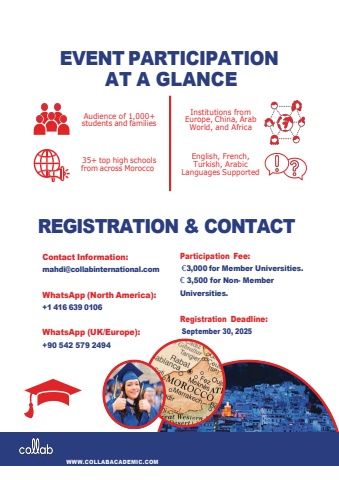 EVENT PARTICIPATIONAT A GLANCEAudience of 1,000+students and families35+ top high schools from across MoroccoInstitutions from Europe, China, Arab World, and AfricaEnglish, French, Turkish, Arabic Languages SupportedREGISTRATION & CONTACTContact Information:mahdi@collabinternational.comWhatsApp (North America):+1 416 639 0106WhatsApp (UK/Europe):+90 542 579 2494Participation Fee:%u20ac3,000 for Member Universities.%u20ac 3,500 for Non- MemberUniversities.Registration Deadline:September 30, 2025WWW.COLLABACADEMIC.COM