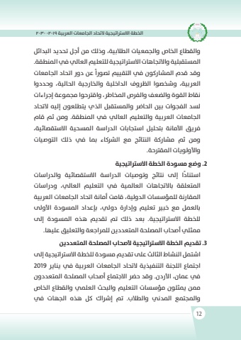 %u0627%u0644%u062e%u0637%u0629 %u0627%u0627%u0644%u0633%u0631%u062a%u0627%u062a%u064a%u062c%u064a%u0629 %u0627%u0644%u062a%u062d%u0627%u062f %u0627%u0644%u062c%u0627%u0645%u0639%u0627%u062a %u0627%u0644%u0639%u0631%u0628%u064a%u0629 2019 -203012%u0648%u0627%u0644%u0642%u0637%u0627%u0639 %u0627%u0644%u062e%u0627%u0635 %u0648%u0627%u0644%u062c%u0645%u0639%u064a%u0627%u062a %u0627%u0644%u0637%u0627%u0644%u0628%u064a%u0629%u060c %u0648%u0630%u0644%u0643 %u0645%u0646 %u0623%u062c%u0644 %u062a%u062d%u062f%u064a%u062f %u0627%u0644%u0628%u062f%u0627%u0626%u0644 %u0627%u0645%u0644%u0633%u062a%u0642%u0628%u0644%u064a%u0629 %u0648%u0627%u0627%u0644%u062a%u062c%u0627%u0647%u0627%u062a %u0627%u0627%u0644%u0633%u0631%u062a%u0627%u062a%u064a%u062c%u064a%u0629 %u0644%u0644%u062a%u0639%u0644%u064a%u0645 %u0627%u0644%u0639%u0627%u064a%u0644 %u064a%u0641 %u0627%u0645%u0644%u0646%u0637%u0642%u0629. %u0648%u0642%u062f %u0642%u062f%u0645 %u0627%u0645%u0644%u0634%u0627%u0631%u0643%u0648%u0646 %u064a%u0641 %u0627%u0644%u062a%u0642%u064a%u064a%u0645 %u062a%u0635%u0648%u0631%u0627%u064b %u0639%u0646 %u062f%u0648%u0631 %u0627%u062a%u062d%u0627%u062f %u0627%u0644%u062c%u0627%u0645%u0639%u0627%u062a %u0627%u0644%u0639%u0631%u0628%u064a%u0629%u060c %u0648%u0634%u062e%u0635%u0648%u0627 %u0627%u0644%u0638%u0631%u0648%u0641 %u0627%u0644%u062f%u0627%u062e%u0644%u064a%u0629 %u0648%u0627%u0644%u062e%u0627%u0631%u062c%u064a%u0629 %u0627%u0644%u062d%u0627%u0644%u064a%u0629%u060c %u0648%u062d%u062f%u062f%u0648%u0627 %u0646%u0642%u0627%u0637 %u0627%u0644%u0642%u0648%u0629 %u0648%u0627%u0644%u0636%u0639%u0641 %u0648%u0627%u0644%u0641%u0631%u0635 %u0627%u0645%u0644%u062e%u0627%u0637%u0631%u060c %u0648%u0627%u0642%u0631%u062a%u062d%u0648%u0627 %u0645%u062c%u0645%u0648%u0639%u0629 %u0625%u062c%u0631%u0627%u0621%u0627%u062a %u0644%u0633%u062f %u0627%u0644%u0641%u062c%u0648%u0627%u062a %u0628%u0646%u064a %u0627%u0644%u062d%u0627%u0631%u0636 %u0648%u0627%u0645%u0644%u0633%u062a%u0642%u0628%u0644 %u0627%u0644%u0630%u064a %u064a%u062a%u0637%u0644%u0639%u0648%u0646 %u0625%u0644%u064a%u0647 %u0627%u0644%u062a%u062d%u0627%u062f %u0627%u0644%u062c%u0627%u0645%u0639%u0627%u062a %u0627%u0644%u0639%u0631%u0628%u064a%u0629 %u0648%u0627%u0644%u062a%u0639%u0644%u064a%u0645 %u0627%u0644%u0639%u0627%u064a%u0644 %u064a%u0641 %u0627%u0645%u0644%u0646%u0637%u0642%u0629. %u0648%u0645%u0646 %u062b%u0645 %u0642%u0627%u0645 %u0641%u0631%u064a%u0642 %u0627%u0623%u0644%u0645%u0627%u0646%u0629 %u0628%u062a%u062d%u0644%u064a%u0644 %u0627%u0633%u062a%u062c%u0627%u0628%u0627%u062a %u0627%u0644%u062f%u0631%u0627%u0633%u0629 %u0627%u0645%u0644%u0633%u062d%u064a%u0629 %u0627%u0627%u0644%u0633%u062a%u0642%u0635%u0627%u0626%u064a%u0629%u060c %u0648%u0645%u0646 %u062b%u0645 %u0645%u0634%u0627%u0631%u0643%u0629 %u0627%u0644%u0646%u062a%u0627%u0626%u062c %u0645%u0639 %u0627%u0644%u0631%u0634%u0643%u0627%u0621 %u0645%u0628%u0627 %u064a%u0641 %u0630%u0644%u0643 %u0627%u0644%u062a%u0648%u0635%u064a%u0627%u062a %u0648%u0627%u0623%u0644%u0648%u0644%u0648%u064a%u0627%u062a %u0627%u0645%u0644%u0642%u0631%u062a%u062d%u0629.2 .%u0648%u0636%u0639 %u0645%u0633%u0648%u062f%u0629 %u0627%u0644%u062e%u0637%u0629 %u0627%u0627%u0644%u0633%u0631%u062a%u0627%u062a%u064a%u062c%u064a%u0629%u064b %u0627%u0633%u062a%u0646%u0627%u062f%u0627 %u0625%u0649%u0644 %u0646%u062a%u0627%u0626%u062c %u0648%u062a%u0648%u0635%u064a%u0627%u062a %u0627%u0644%u062f%u0631%u0627%u0633%u0629 %u0627%u0627%u0644%u0633%u062a%u0642%u0635%u0627%u0626%u064a%u0629 %u0648%u0627%u0644%u062f%u0631%u0627%u0633%u0627%u062a %u0627%u0645%u0644%u062a%u0639%u0644%u0642%u0629 %u0628%u0627%u0627%u0644%u062a%u062c%u0627%u0647%u0627%u062a %u0627%u0644%u0639%u0627%u0645%u0644%u064a%u0629 %u064a%u0641 %u0627%u0644%u062a%u0639%u0644%u064a%u0645 %u0627%u0644%u0639%u0627%u064a%u0644%u060c %u0648%u062f%u0631%u0627%u0633%u0627%u062a %u0627%u0645%u0644%u0642%u0627%u0631%u0646%u0629 %u0644%u0644%u0645%u0624%u0633%u0633%u0627%u062a %u0627%u0644%u062f%u0648%u0644%u064a%u0629%u060c %u0642%u0627%u0645%u062a %u0623%u0645%u0627%u0646%u0629 %u0627%u062a%u062d%u0627%u062f %u0627%u0644%u062c%u0627%u0645%u0639%u0627%u062a %u0627%u0644%u0639%u0631%u0628%u064a%u0629 %u0628%u0627%u0644%u0639%u0645%u0644 %u0645%u0639 %u062e%u0628%u0631%u064a %u062a%u0639%u0644%u064a%u0645 %u0648%u0625%u062f%u0627%u0631%u0629 %u062f%u0648%u064a%u0644%u060c %u0628%u0625%u0639%u062f%u0627%u062f %u0627%u0645%u0644%u0633%u0648%u062f%u0629 %u0627%u0623%u0644%u0648%u0649%u0644 %u0644%u0644%u062e%u0637%u0629 %u0627%u0627%u0644%u0633%u0631%u062a%u0627%u062a%u064a%u062c%u064a%u0629. %u0628%u0639%u062f %u0630%u0644%u0643 %u062a%u0645 %u062a%u0642%u062f%u064a%u0645 %u0647%u0630%u0647 %u0627%u0645%u0644%u0633%u0648%u062f%u0629 %u0625%u0649%u0644 %u0645%u0645%u062b%u064a%u0644 %u0623%u0635%u062d%u0627%u0628 %u0627%u0645%u0644%u0635%u0644%u062d%u0629 %u0627%u0645%u0644%u062a%u0639%u062f%u062f%u064a%u0646 %u0644%u0644%u0645%u0631%u0627%u062c%u0639%u0629 %u0648%u0627%u0644%u062a%u0639%u0644%u064a%u0642 %u0639%u0644%u064a%u0647%u0627. 3 .%u062a%u0642%u062f%u064a%u0645 %u0627%u0644%u062e%u0637%u0629 %u0627%u0627%u0644%u0633%u0631%u062a%u0627%u062a%u064a%u062c%u064a%u0629 %u0623%u0644%u0635%u062d%u0627%u0628 %u0627%u0645%u0644%u0635%u0644%u062d%u0629 %u0627%u0645%u0644%u062a%u0639%u062f%u062f%u064a%u0646%u0627%u0634%u062a%u0645%u0644 %u0627%u0644%u0646%u0634%u0627%u0637 %u0627%u0644%u062b%u0627%u0644%u062b %u0639%u0649%u0644 %u062a%u0642%u062f%u064a%u0645 %u0645%u0633%u0648%u062f%u0629 %u0644%u0644%u062e%u0637%u0629 %u0627%u0627%u0644%u0633%u0631%u062a%u0627%u062a%u064a%u062c%u064a%u0629 %u0625%u0649%u0644 %u0627%u062c%u062a%u0627%u0645%u0639 %u0627%u0644%u0644%u062c%u0646%u0629 %u0627%u0644%u062a%u0646%u0641%u064a%u0630%u064a%u0629 %u0627%u0644%u062a%u062d%u0627%u062f %u0627%u0644%u062c%u0627%u0645%u0639%u0627%u062a %u0627%u0644%u0639%u0631%u0628%u064a%u0629 %u064a%u0641 %u064a%u0646%u0627%u064a%u0631 2019%u064a%u0641 %u0639%u0627%u0645%u0646%u060c %u0627%u0623%u0644%u0631%u062f%u0646. 