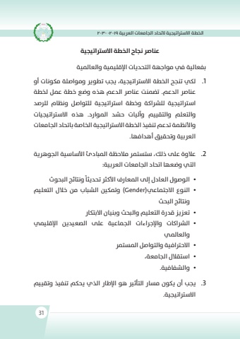 %u0627%u0644%u062e%u0637%u0629 %u0627%u0627%u0644%u0633%u0631%u062a%u0627%u062a%u064a%u062c%u064a%u0629 %u0627%u0644%u062a%u062d%u0627%u062f %u0627%u0644%u062c%u0627%u0645%u0639%u0627%u062a %u0627%u0644%u0639%u0631%u0628%u064a%u0629 2019 -203031%u0639%u0646%u0627%u0631%u0635 %u0646%u062c%u0627%u062d %u0627%u0644%u062e%u0637%u0629 %u0627%u0627%u0644%u0633%u0631%u062a%u0627%u062a%u064a%u062c%u064a%u0629%u0628%u0641%u0639%u0627%u0644%u064a%u0629 %u064a%u0641 %u0645%u0648%u0627%u062c%u0647%u0629 %u0627%u0644%u062a%u062d%u062f%u064a%u0627%u062a %u0627%u0625%u0644%u0642%u0644%u064a%u0645%u064a%u0629 %u0648%u0627%u0644%u0639%u0627%u0645%u0644%u064a%u06291 .%u0644%u064a%u0643 %u062a%u0646%u062c%u062d %u0627%u0644%u062e%u0637%u0629 %u0627%u0627%u0644%u0633%u0631%u062a%u0627%u062a%u064a%u062c%u064a%u0629%u060c %u064a%u062c%u0628 %u062a%u0637%u0648%u064a%u0631 %u0648%u0645%u0648%u0627%u0635%u0644%u0629 %u0645%u0643%u0648%u0646%u0627%u062a %u0623%u0648 %u0639%u0646%u0627%u0631%u0635 %u0627%u0644%u062f%u0639%u0645. %u062a%u0636%u0645%u0646%u062a %u0639%u0646%u0627%u0631%u0635 %u0627%u0644%u062f%u0639%u0645 %u0647%u0630%u0647 %u0648%u0636%u0639 %u062e%u0637%u0629 %u0639%u0645%u0644 %u0644%u062e%u0637%u0629 %u0627%u0633%u0631%u062a%u0627%u062a%u064a%u062c%u064a%u0629 %u0644%u0644%u0631%u0634%u0627%u0643%u0629 %u0648%u062e%u0637%u0629 %u0627%u0633%u0631%u062a%u0627%u062a%u064a%u062c%u064a%u0629 %u0644%u0644%u062a%u0648%u0627%u0635%u0644 %u0648%u0646%u0638%u0627%u0645 %u0644%u0644%u0631%u0635%u062f %u0648%u0627%u0644%u062a%u0639%u0644%u0645 %u0648%u0627%u0644%u062a%u0642%u064a%u064a%u0645 %u0648%u0622%u0644%u064a%u0627%u062a %u062d%u0634%u062f %u0627%u0645%u0644%u0648%u0627%u0631%u062f. %u0647%u0630%u0647 %u0627%u0627%u0644%u0633%u0631%u062a%u0627%u062a%u064a%u062c%u064a%u0627%u062a %u0648%u0627%u0623%u0644%u0646%u0638%u0645%u0629 %u062a%u062f%u0639%u0645 %u062a%u0646%u0641%u064a%u0630 %u0627%u0644%u062e%u0637%u0629 %u0627%u0627%u0644%u0633%u0631%u062a%u0627%u062a%u064a%u062c%u064a%u0629 %u0627%u0644%u062e%u0627%u0635%u0629 %u0628%u0627%u062a%u062d%u0627%u062f %u0627%u0644%u062c%u0627%u0645%u0639%u0627%u062a %u0627%u0644%u0639%u0631%u0628%u064a%u0629 %u0648%u062a%u062d%u0642%u064a%u0642 %u0623%u0647%u062f%u0627%u0641%u0647%u0627.2 .%u0639%u0627%u0644%u0648%u0629 %u0639%u0649%u0644 %u0630%u0644%u0643%u060c %u0633%u062a%u0633%u062a%u0645%u0631 %u0645%u0627%u0644%u062d%u0638%u0629 %u0627%u0645%u0644%u0628%u0627%u062f%u0626 %u0627%u0623%u0644%u0633%u0627%u0633%u064a%u0629 %u0627%u0644%u062c%u0648%u0647%u0631%u064a%u0629 %u0627%u0644%u062a%u064a %u0648%u0636%u0639%u0647%u0627 %u0627%u062a%u062d%u0627%u062f %u0627%u0644%u062c%u0627%u0645%u0639%u0627%u062a %u0627%u0644%u0639%u0631%u0628%u064a%u0629:%u0009 %u0627%u0644%u0648%u0635%u0648%u0644 %u0627%u0644%u0639%u0627%u062f%u0644 %u0625%u0649%u0644 %u0627%u0645%u0644%u0639%u0627%u0631%u0641 %u0627%u0623%u0644%u0643%u0631%u062b %u062a%u062d%u062f%u064a%u062b%u0627%u064b %u0648%u0646%u062a%u0627%u0626%u062c %u0627%u0644%u0628%u062d%u0648%u062b%u0009 %u0627%u0644%u0646%u0648%u0639 %u0627%u0627%u0644%u062c%u062a%u0627%u0645%u0639%u064a)Gender )%u0648%u0645%u062a%u0643%u0646%u064a %u0627%u0644%u0634%u0628%u0627%u0628 %u0645%u0646 %u062e%u0627%u0644%u0644 %u0627%u0644%u062a%u0639%u0644%u064a%u0645 %u0648%u0646%u062a%u0627%u0626%u062c %u0627%u0644%u0628%u062d%u062b%u0009 %u062a%u0639%u0632%u064a%u0632 %u0642%u062f%u0631%u0629 %u0627%u0644%u062a%u0639%u0644%u064a%u0645 %u0648%u0627%u0644%u0628%u062d%u062b %u0648%u0628%u0646%u064a%u0627%u0646 %u0627%u0627%u0644%u0628%u062a%u0643%u0627%u0631%u0009 %u0627%u0644%u0631%u0634%u0627%u0643%u0627%u062a %u0648%u0627%u0625%u0644%u062c%u0631%u0627%u0621%u0627%u062a %u0627%u0644%u062c%u0627%u0645%u0639%u064a%u0629 %u0639%u0649%u0644 %u0627%u0644%u0635%u0639%u064a%u062f%u064a%u0646 %u0627%u0625%u0644%u0642%u0644%u064a%u0645%u064a %u0648%u0627%u0644%u0639%u0627%u0645%u0644%u064a%u0009 %u0627%u0627%u0644%u062d%u0631%u062a%u0627%u0641%u064a%u0629 %u0648%u0627%u0644%u062a%u0648%u0627%u0635%u0644 %u0627%u0645%u0644%u0633%u062a%u0645%u0631%u0009 %u0627%u0633%u062a%u0642%u0627%u0644%u0644 %u0627%u0644%u062c%u0627%u0645%u0639%u0629%u060c %u0009 %u0648%u0627%u0644%u0634%u0641%u0627%u0641%u064a%u0629.3 .%u064a%u062c%u0628 %u0623%u0646 %u064a%u0643%u0648%u0646 %u0645%u0633%u0627%u0631 %u0627%u0644%u062a%u0623%u062b%u0631%u064a %u0647%u0648 %u0627%u0625%u0644%u0637%u0627%u0631 %u0627%u0644%u0630%u064a %u064a%u062d%u0643%u0645 %u062a%u0646%u0641%u064a%u0630 %u0648%u062a%u0642%u064a%u064a%u0645 %u0627%u0627%u0644%u0633%u0631%u062a%u0627%u062a%u064a%u062c%u064a%u0629.